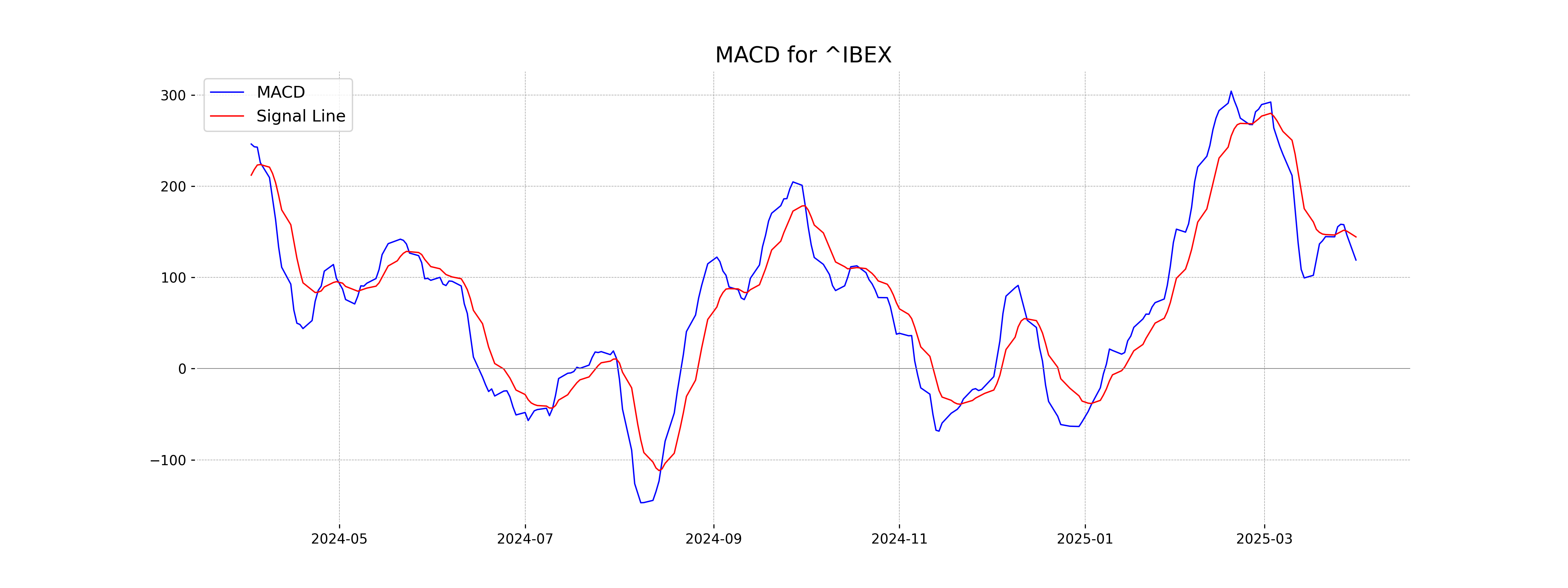 The IBEX 35's MACD value is 118.98, which is below the MACD Signal line of 144.36. This indicates a potential bearish momentum, as the MACD line crossing below the signal line often suggests a potential sell signal. Caution is advised, as the RSI is relatively neutral at 48.23.
