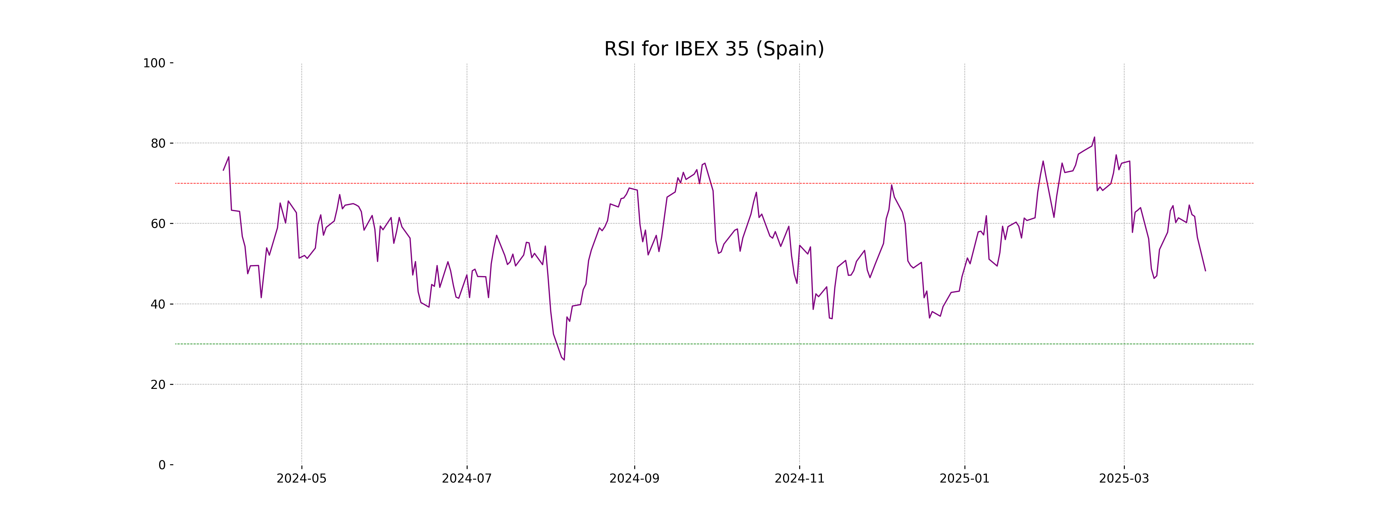 The RSI (Relative Strength Index) for IBEX 35 is 48.23, which suggests that the index is in a neutral zone. An RSI within the range of 30 to 70 implies that the index is neither overbought nor oversold, indicating a balanced momentum at this time.