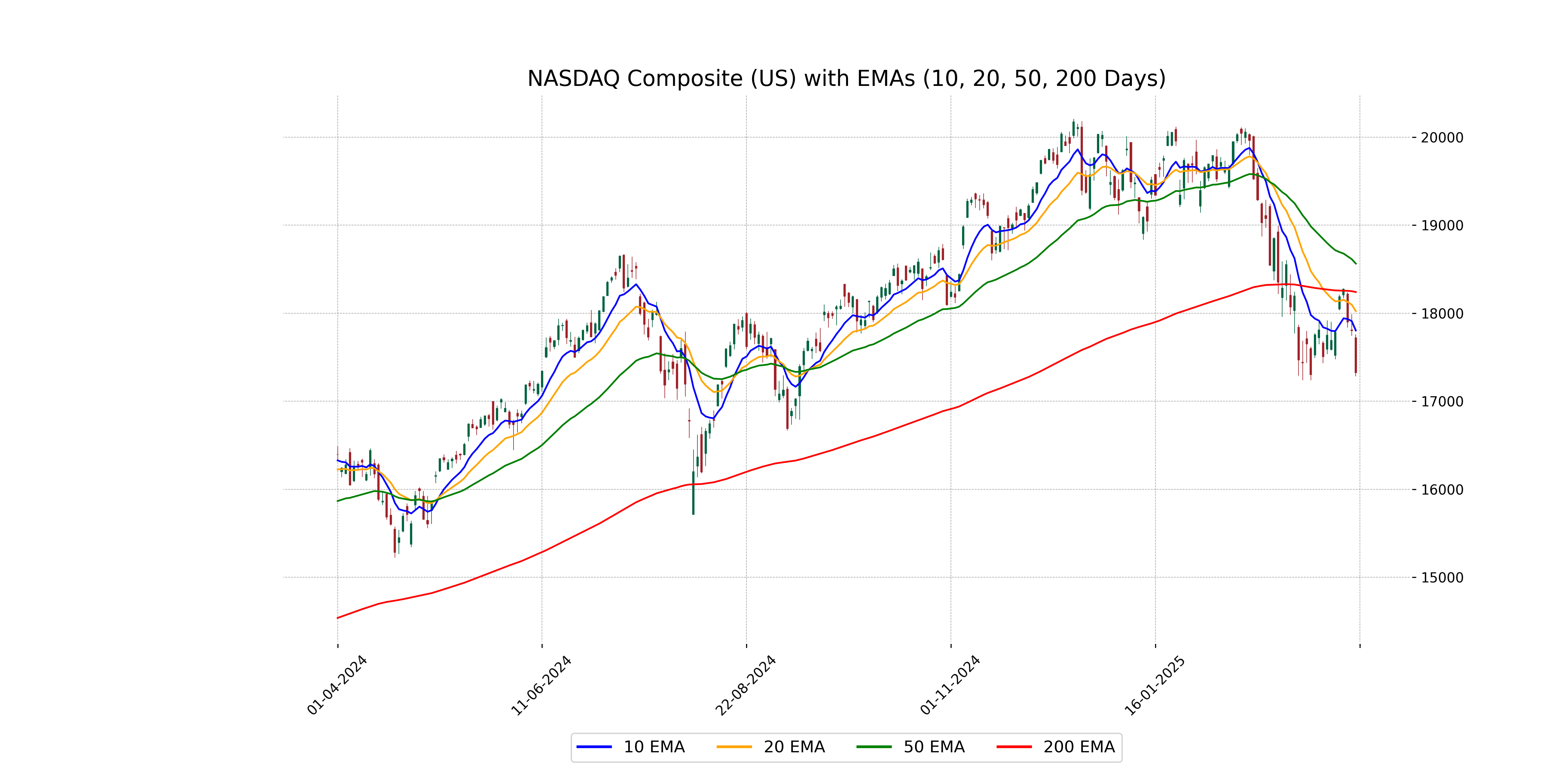 The NASDAQ Composite's current closing price of 17322.99 is below its 10-day EMA of 17803.42, 20-day EMA of 18022.998, 50-day EMA of 18562.981, and 200-day EMA of 18240.265, indicating a bearish trend. Additionally, the RSI is at 36.55, which approaches an oversold condition.