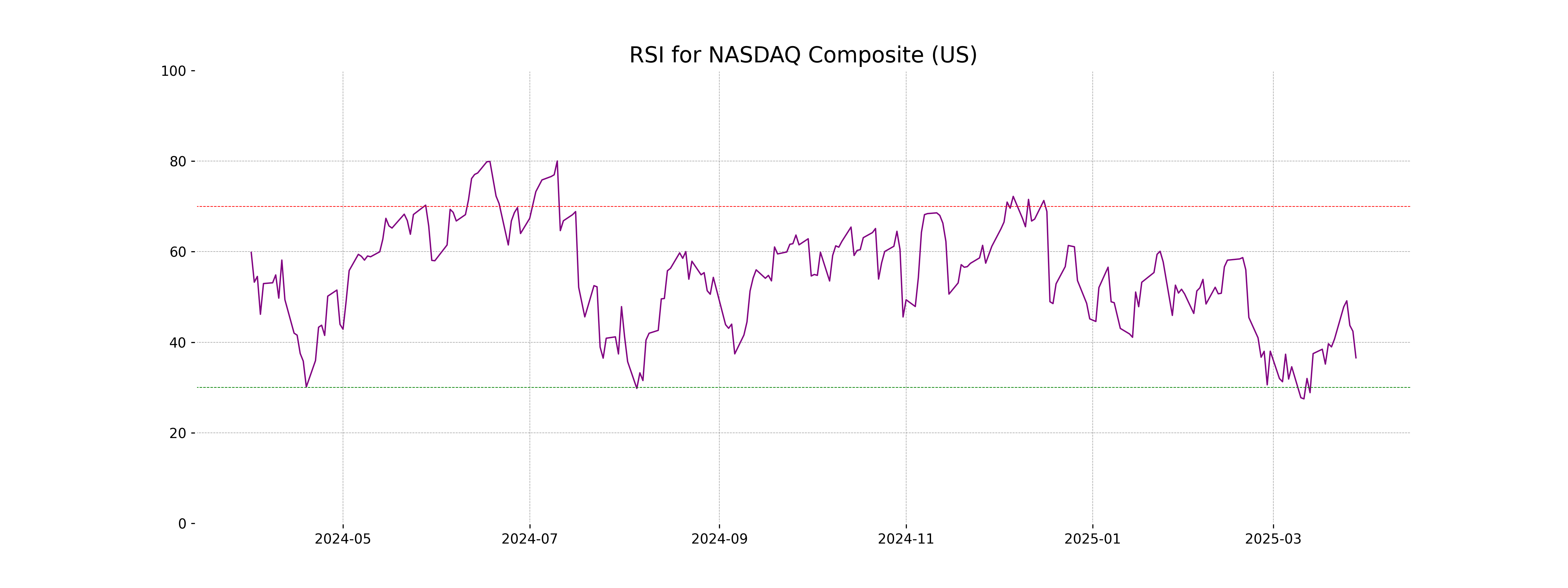 The RSI for NASDAQ Composite is at 36.55, indicating that the market is approaching oversold conditions, as values below 30 generally signal oversold levels. Investors may watch for a potential rebound or further declines depending on market conditions.