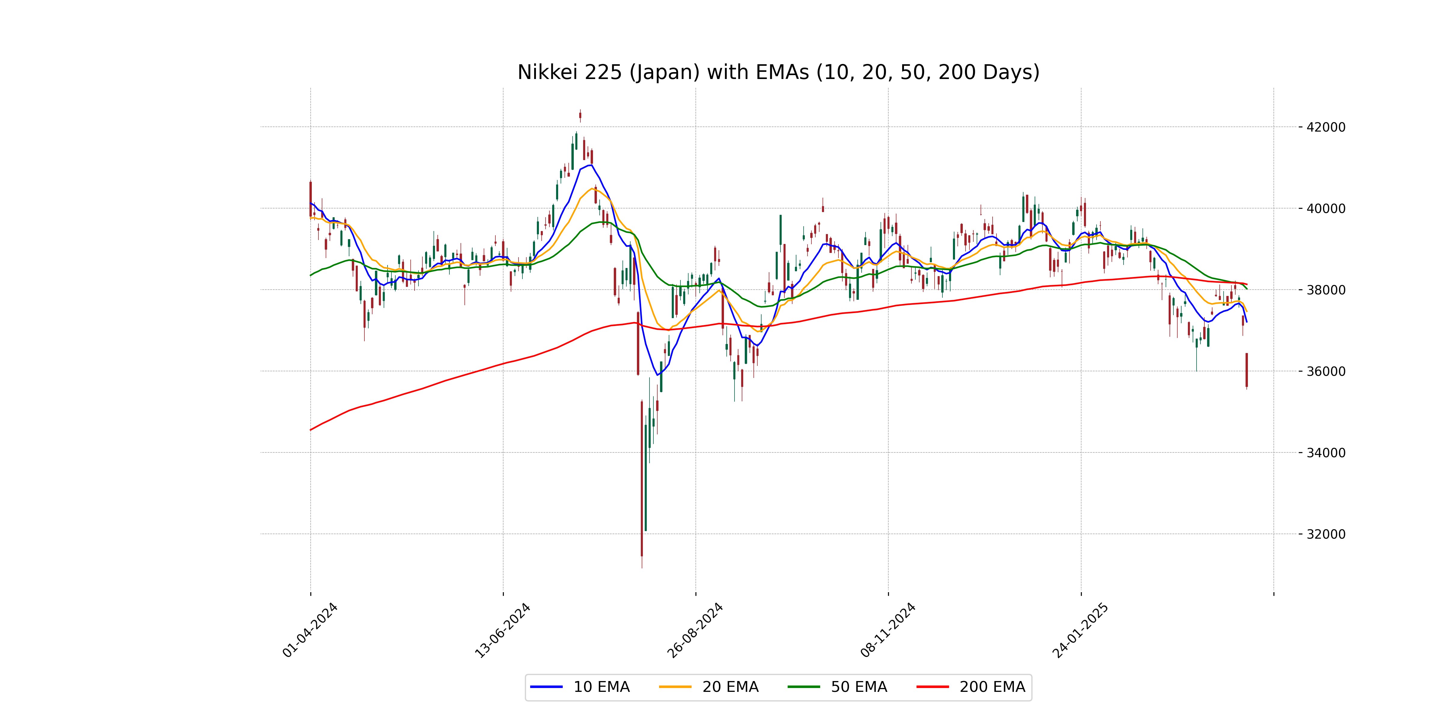 The Nikkei 225 is trading below its 50-day EMA (38,023.94), 200-day EMA (38,131.74), 10-day EMA (37,211.57), and 20-day EMA (37,468.94), indicating a bearish trend. Additionally, the RSI value of 29.06 suggests the index is in oversold territory.