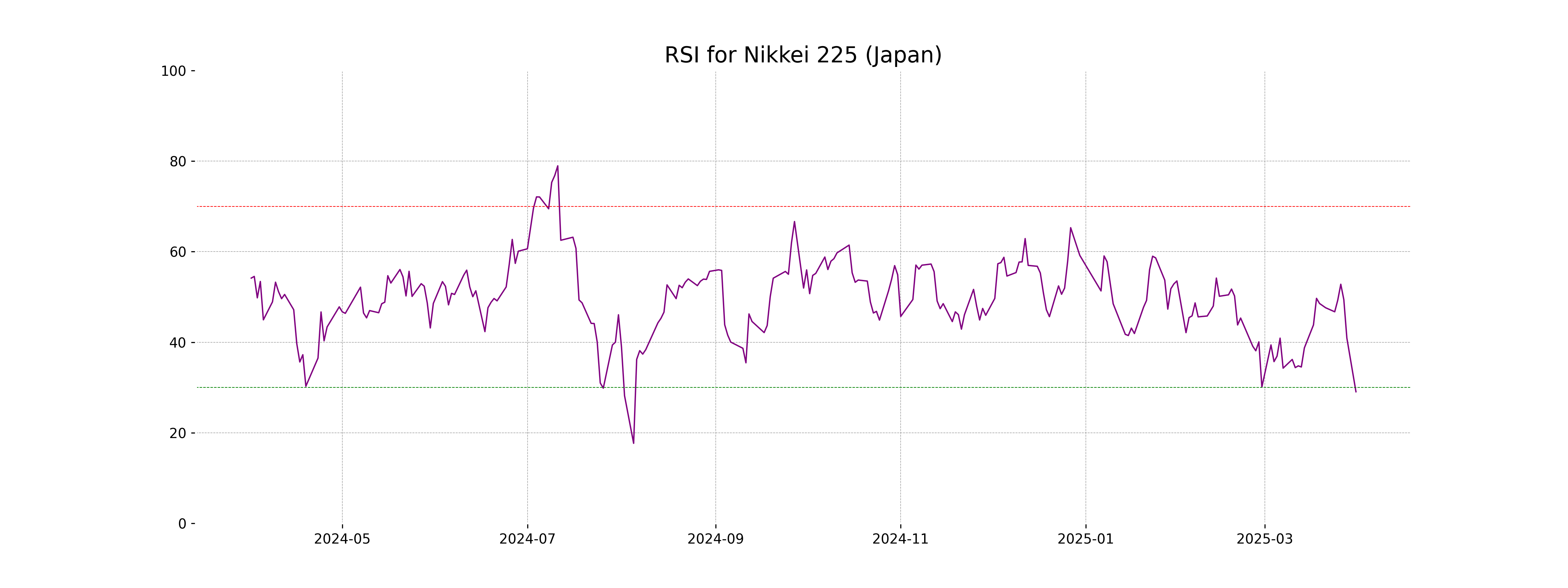 The RSI of Nikkei 225 (Japan) is 29.06, which suggests that the index is in the oversold territory, typically indicating a potential for a price reversal or a relief rally. However, further analysis and confirmation from other indicators are recommended before making any trading decisions.