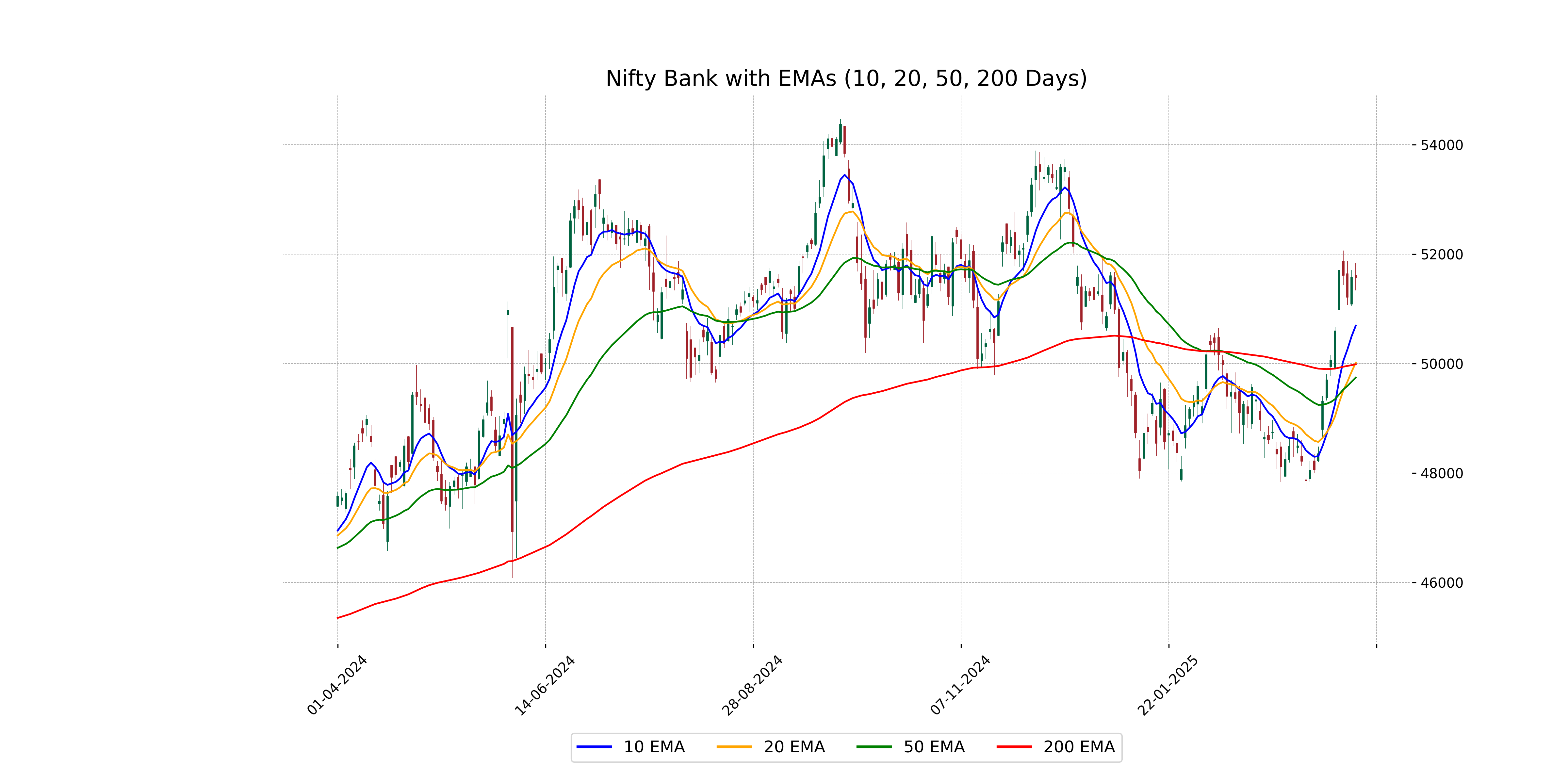 Nifty Bank closed at 51,564.85, near its 10-day EMA of 50,691.73, indicating potential upward momentum. It remains above both the 50-day EMA of 49,743.46 and the 200-day EMA of 49,986.79, suggesting a strong bullish trend.