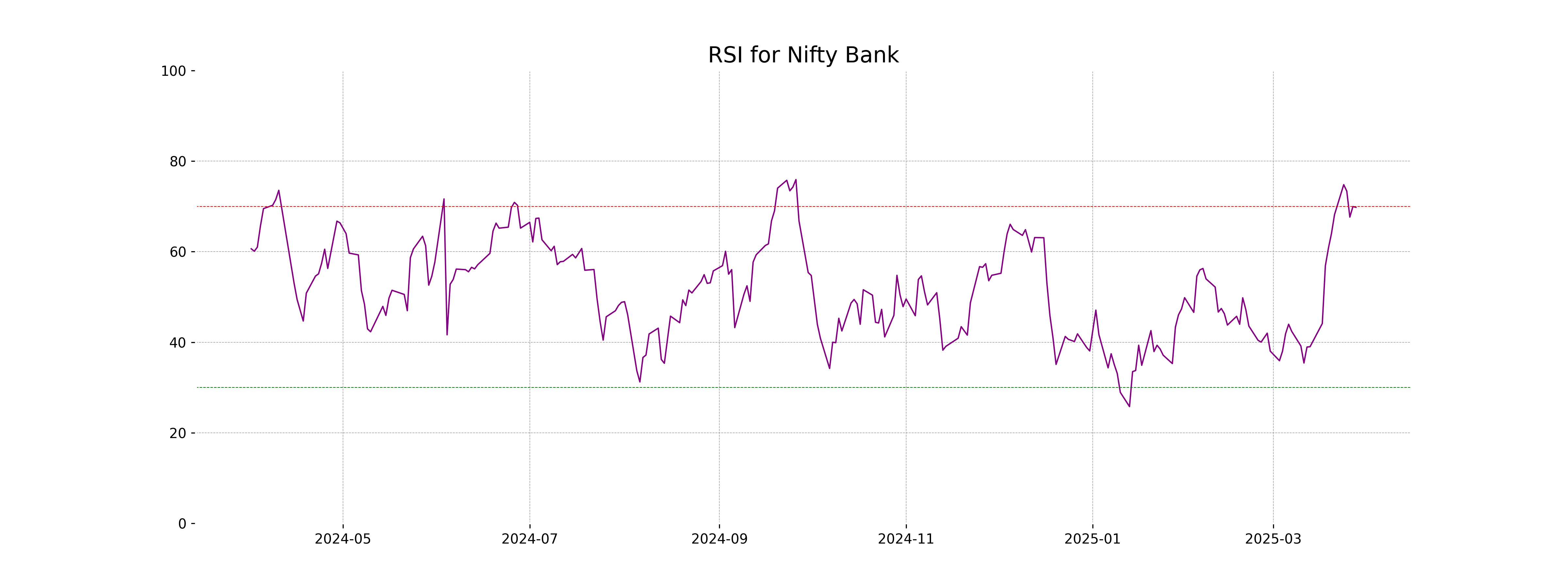 The RSI for Nifty Bank is 69.80, which is close to the overbought threshold of 70. This suggests that the index could be nearing overbought conditions, indicating potential for a downward correction or consolidation in the near future.
