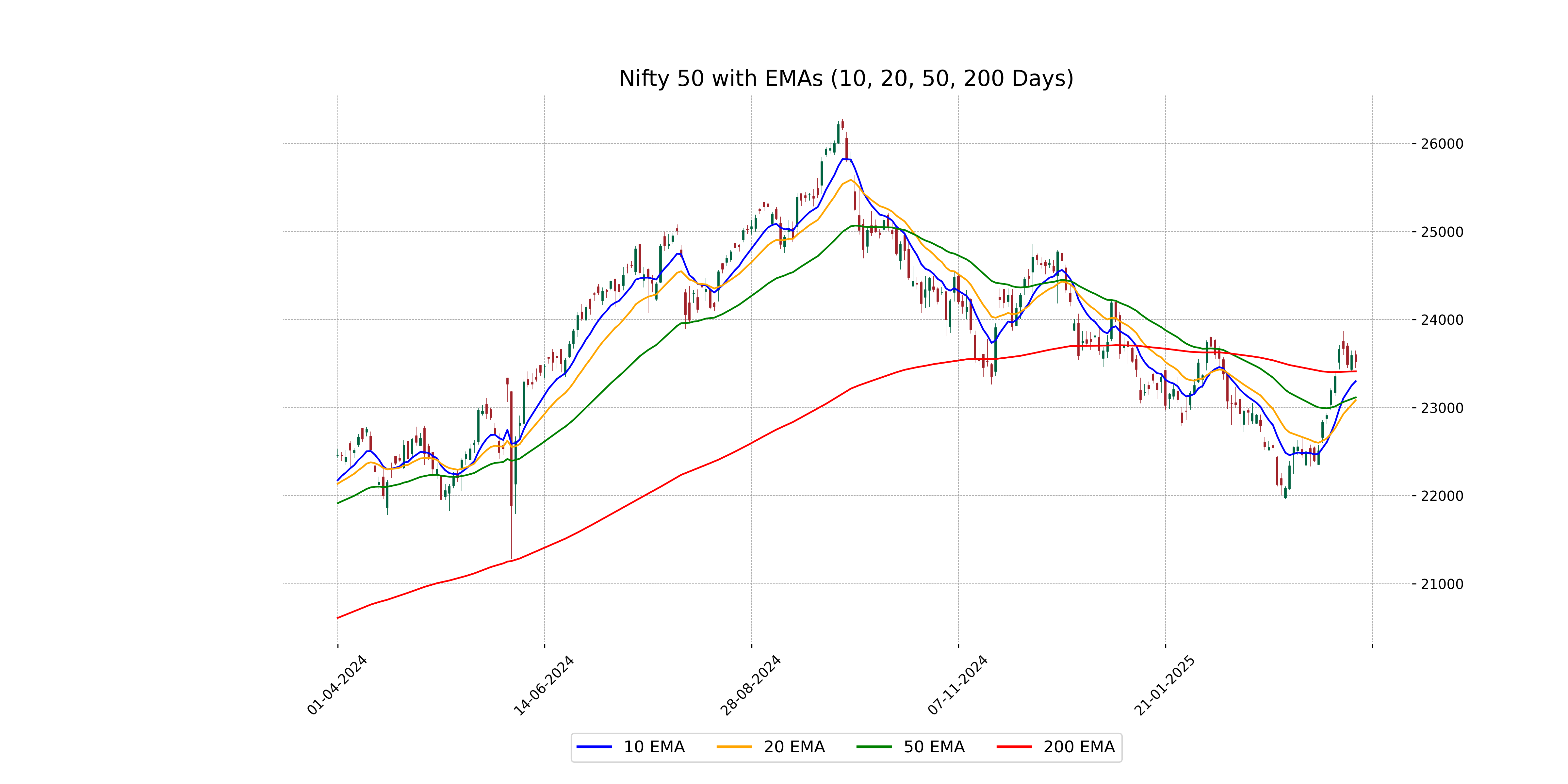 The Nifty 50's current close of 23,519.35 is above its 20-day EMA of 23,083.91 and the 10-day EMA of 23,299.32, indicating a short-term positive trend. However, it is close to the 50-day EMA of 23,115.95, suggesting a consolidation phase. Additionally, it remains above the 200-day EMA of 23,410.94, which signifies a potential long-term bullish trend.