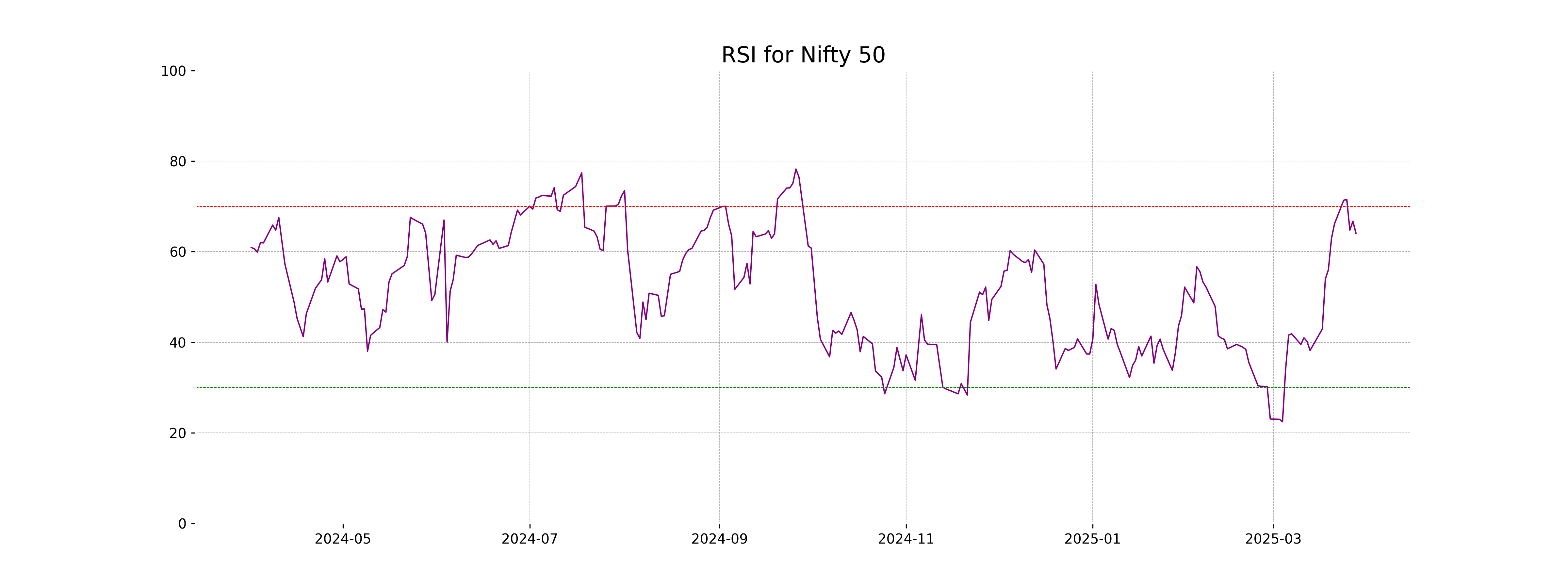 Nifty 50 is currently exhibiting an RSI value of 64.07. This indicates a potentially overbought condition, suggesting possible bullish momentum, but it is approaching levels where a reversal or consolidation might occur. Traders should monitor closely for any signs of a trend reversal.