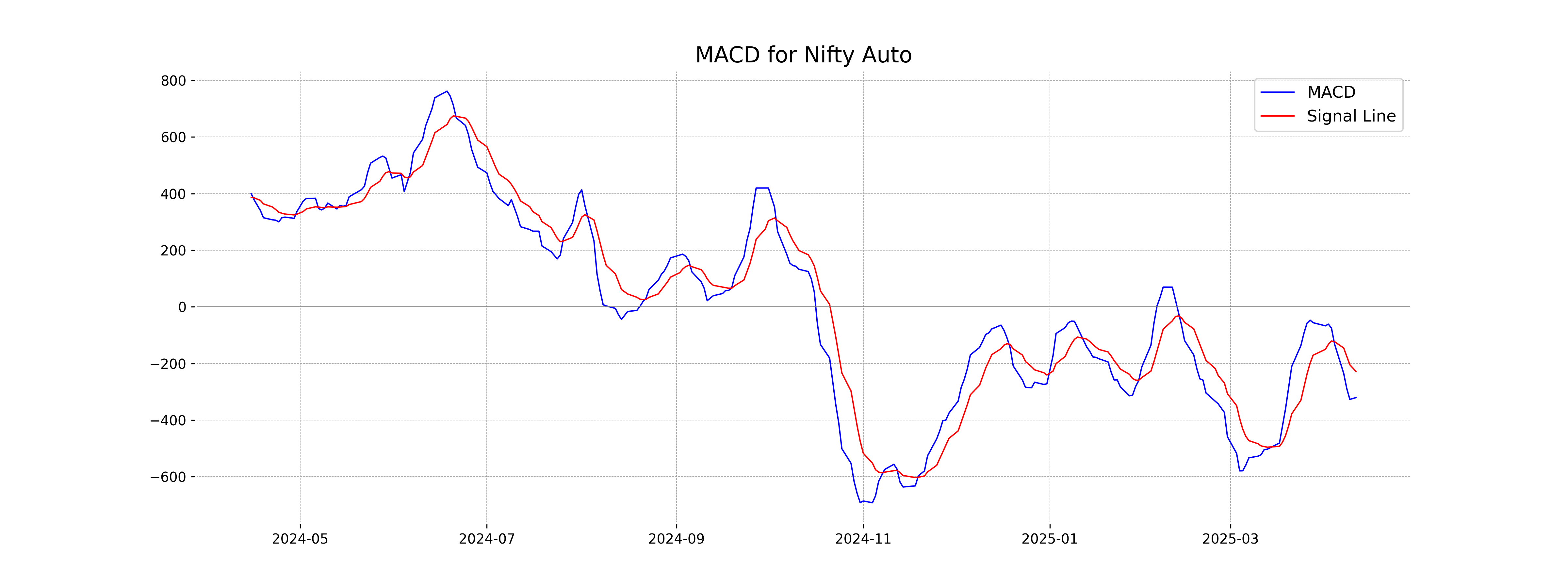 Based on the given MACD analysis for Nifty Auto, the MACD value is -320.71, which is below the MACD Signal line of -227.94. This indicates a bearish signal, suggesting that the stock may experience downward momentum in the short term.