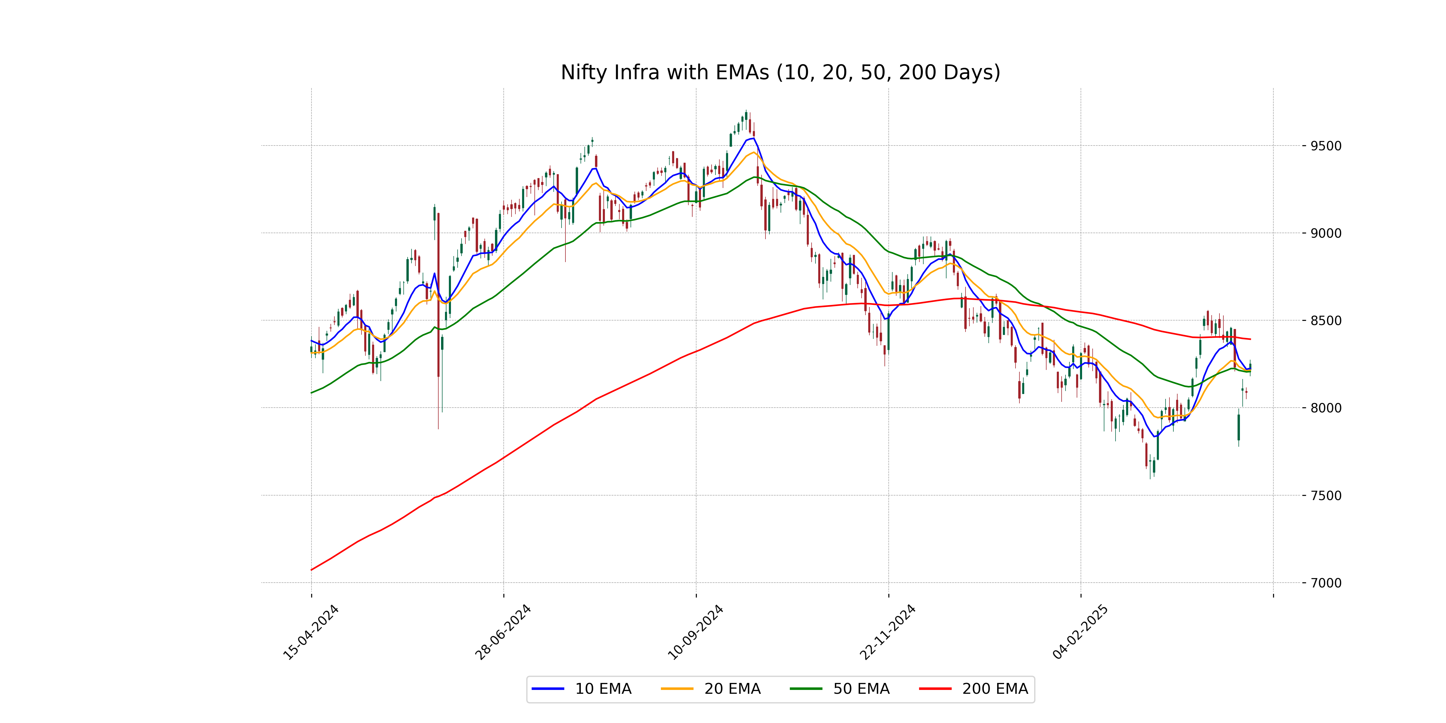 Nifty Infra closed at 8250.15, which is above the 50 EMA of 8206.81 and below the 200 EMA of 8392.07. The index is also slightly above the 10 EMA of 8225.11 and the 20 EMA of 8214.51, suggesting a short-term upward movement.