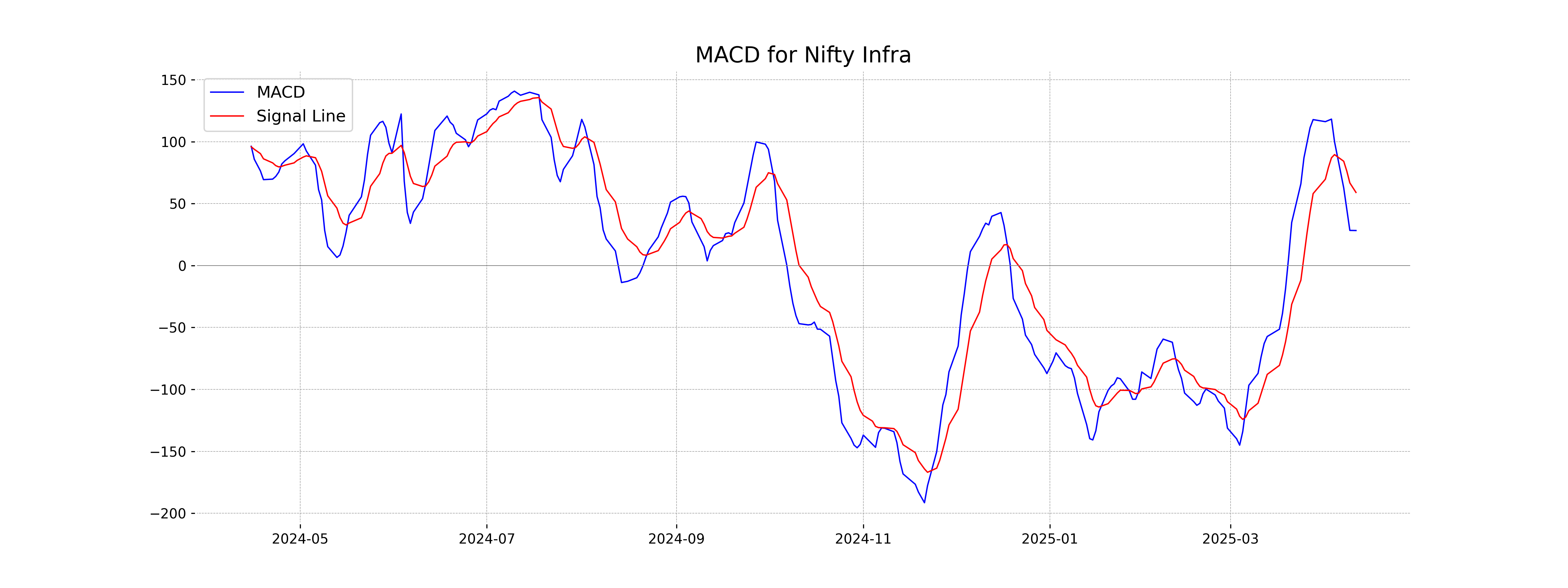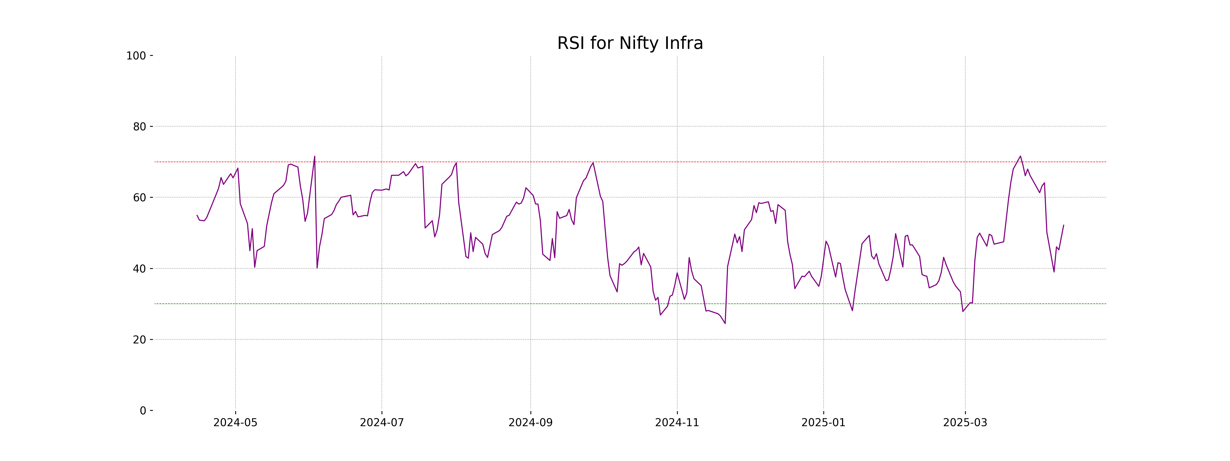Nifty Infra's RSI is at 52.14, indicating a neutral position without clear overbought or oversold signals. This suggests a balanced sentiment in the market, with neither strong bullish nor bearish momentum currently evident.