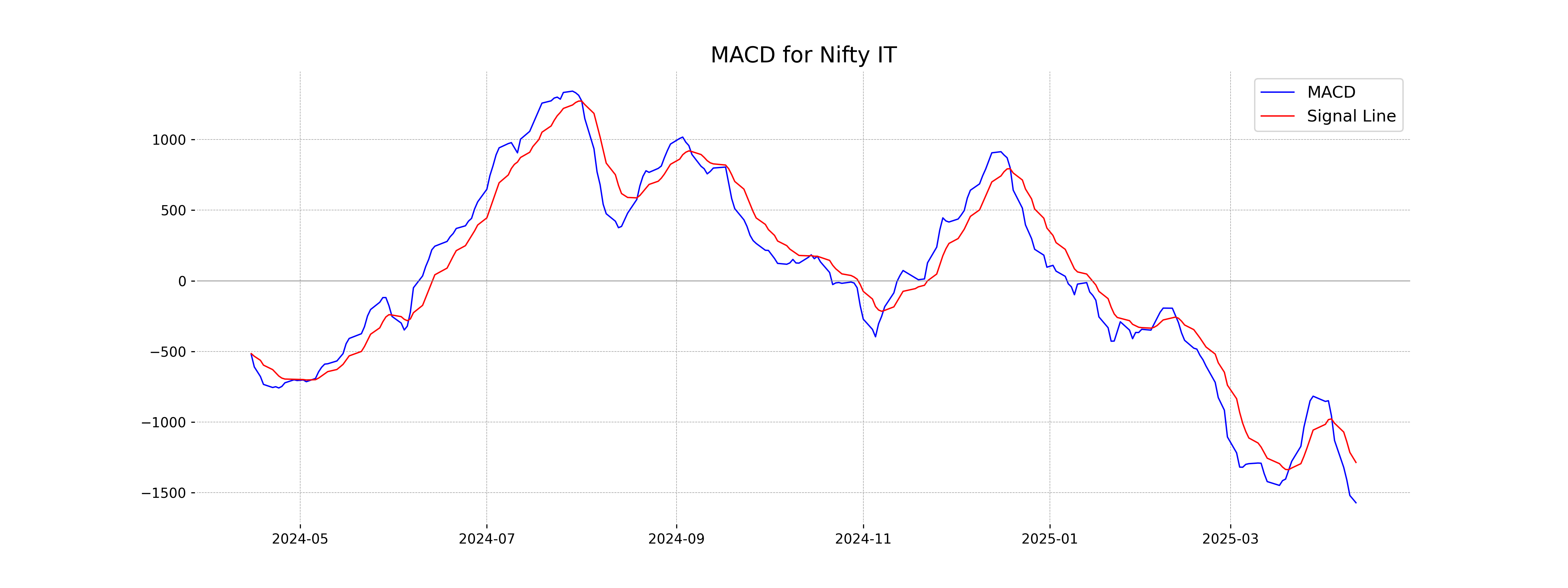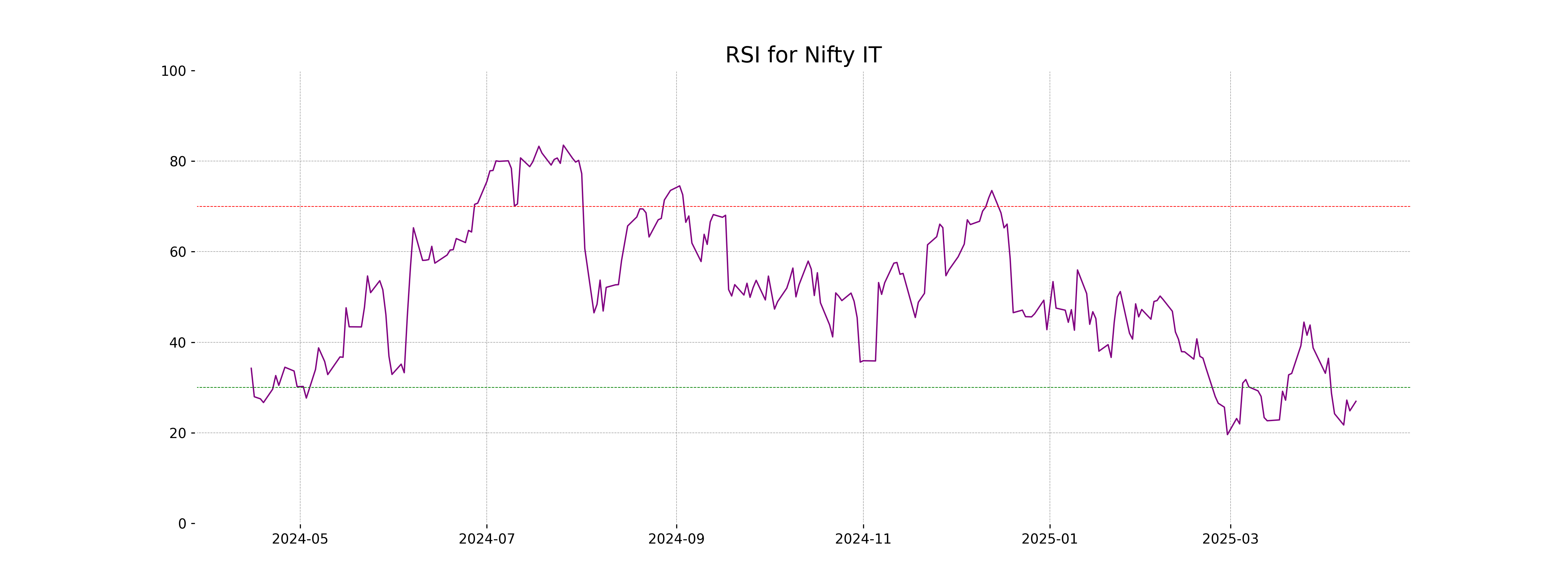 RSI Analysis: The current RSI for Nifty IT is 26.95, which falls below the typical oversold threshold of 30. This indicates that the index may be undervalued and could potentially be due for a price correction or rebound if buying interest increases.