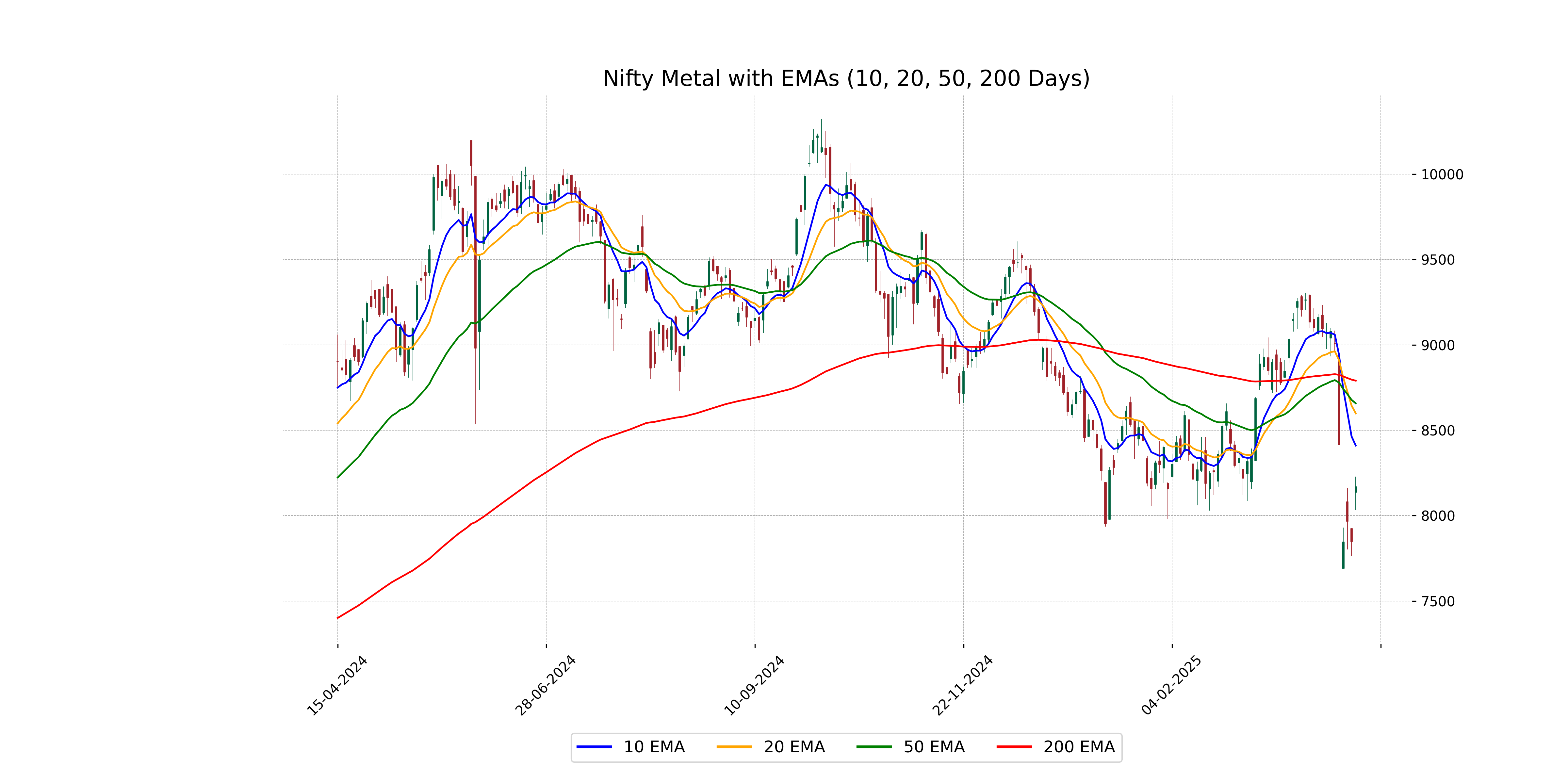 Nifty Metal is trading below its key moving averages, with the current close of 8168.30 significantly beneath the 50 EMA at 8657.57 and the 200 EMA at 8789.92. This indicates a bearish trend as the index remains under these longer-term moving averages.