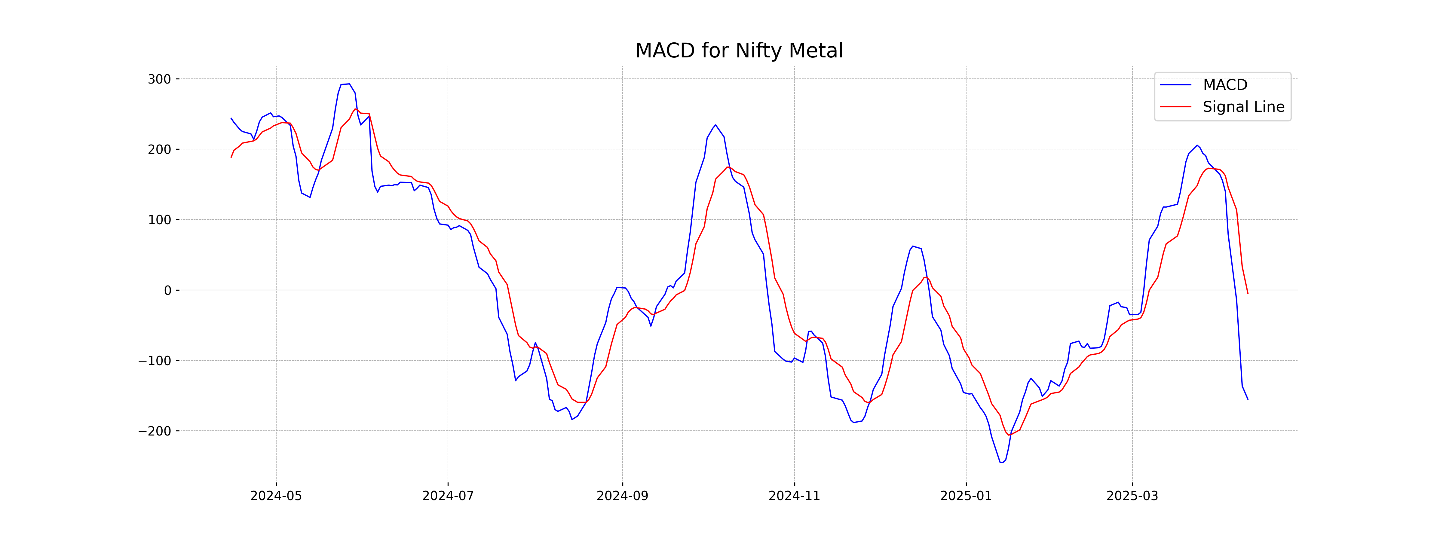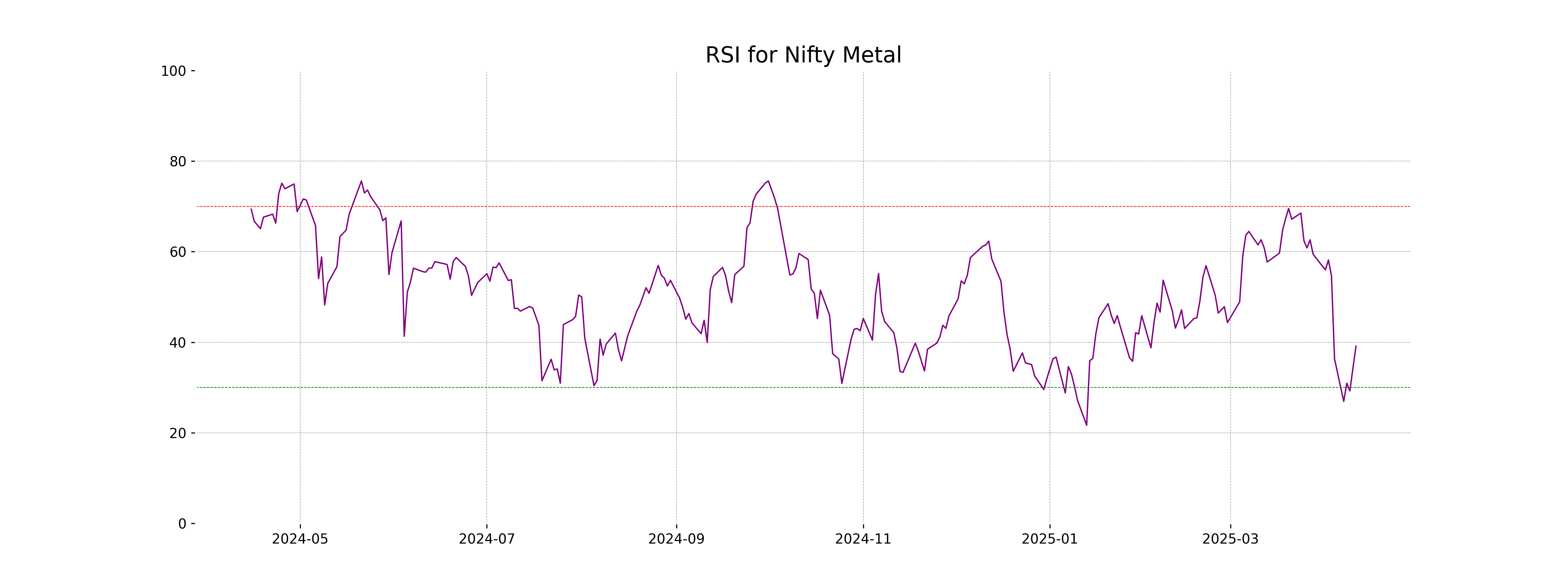 The Relative Strength Index (RSI) for Nifty Metal is 39.13, which typically suggests that the index is approaching oversold conditions. When RSI is below 30, it is generally considered oversold, and it indicates that the index may be undervalued in the short term. Further monitoring would be required to determine if the trend continues towards overbought or stays in oversold territory.