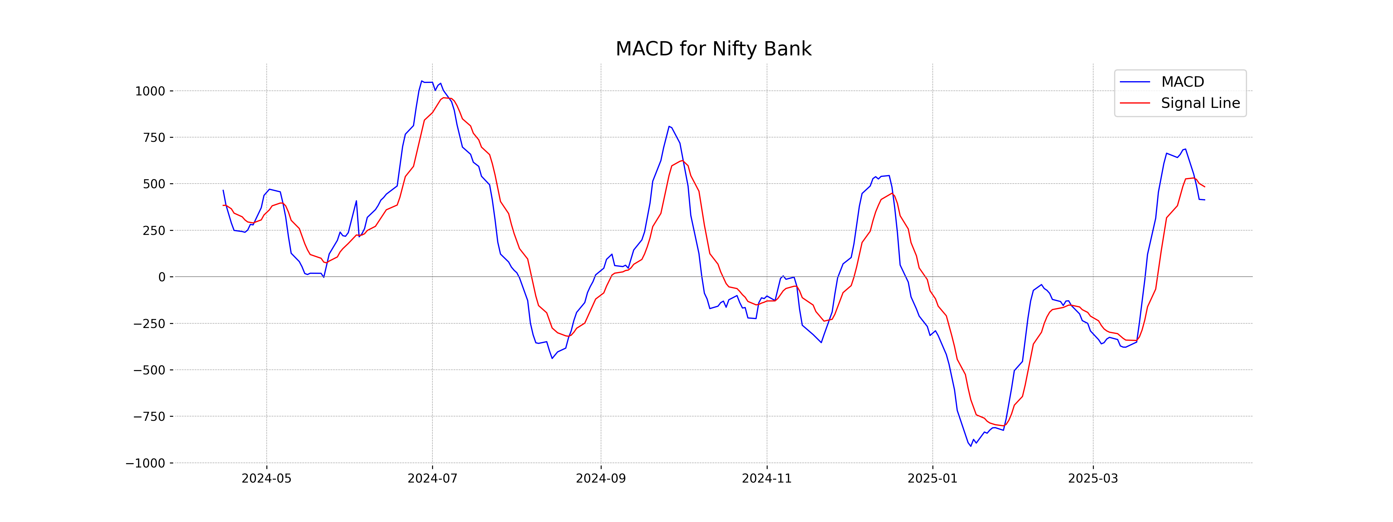Based on the data for Nifty Bank, the MACD line is at 413.26, while the MACD Signal line is at 483.66, indicating that the MACD line is below the signal line. This suggests a bearish trend, as it might indicate a potential decrease in price momentum. However, with the MACD just below the signal, traders may look for future crossover opportunities.
