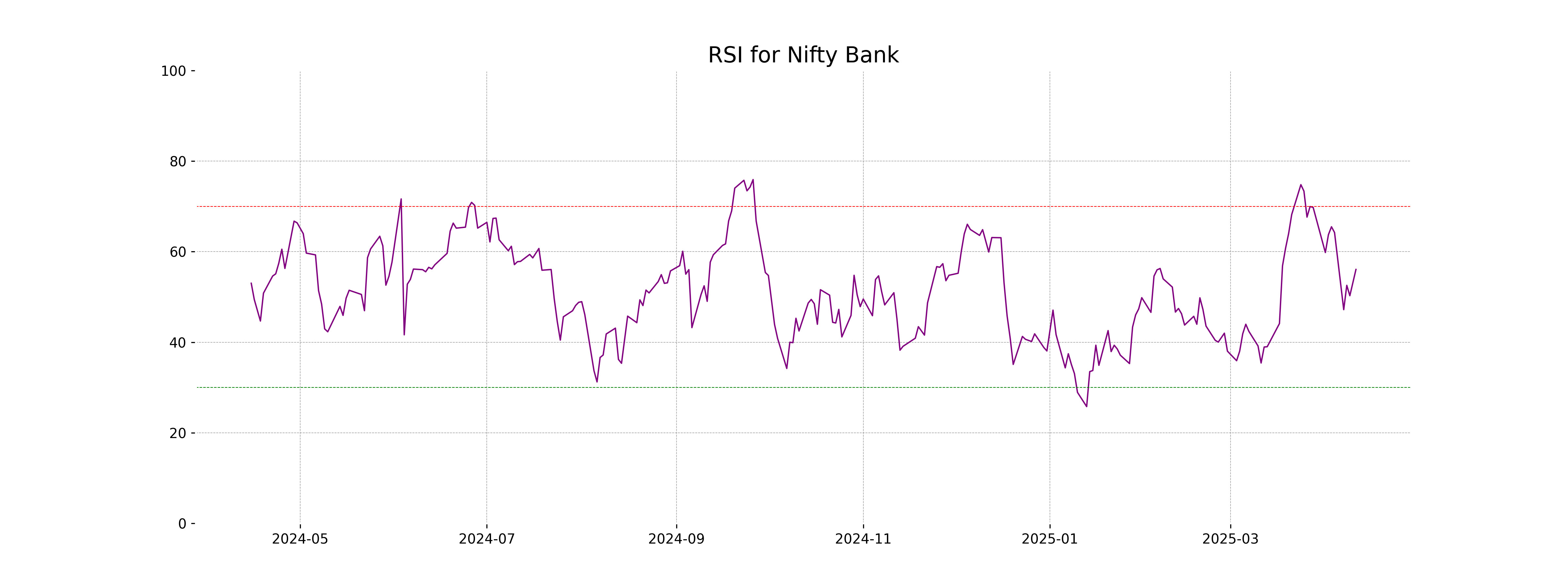 The RSI value for Nifty Bank is 56.08, indicating a neutral market condition. This suggests that the stock is neither overbought nor oversold at the moment. Traders might perceive this level as an opportunity to observe for potential trends or changes.