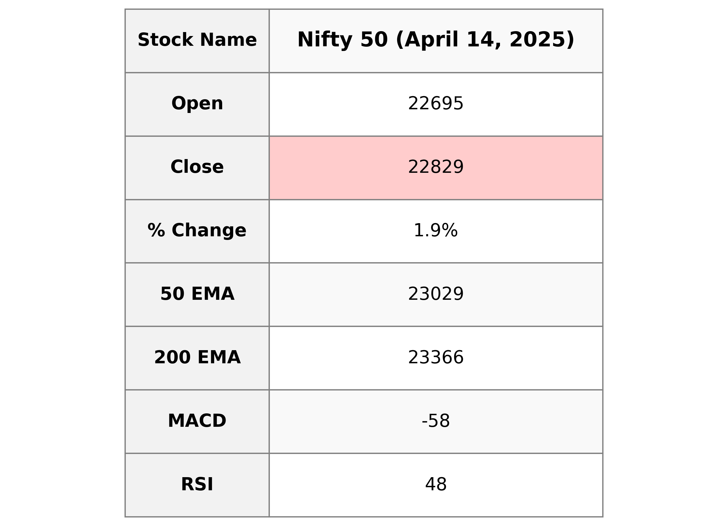 Nifty 50 opened at 22695.40 and closed higher at 22828.55, marking a gain of 1.92% or 429.40 points. Despite the positive close, the MACD is negative, indicating potential bearish momentum, while the RSI is near neutral at 48.35. The index is trading below its 50-day EMA of 23028.87, suggesting a short-term downtrend.