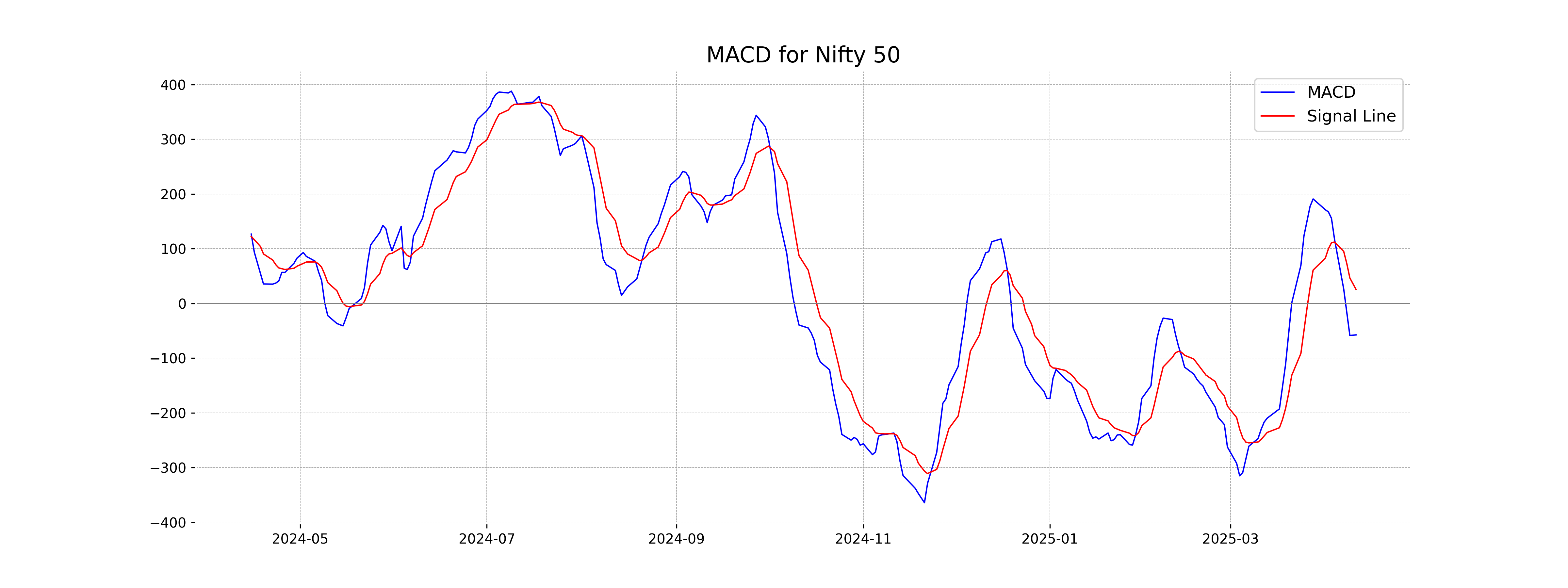 Nifty 50's MACD value of -57.55 with a signal line at 25.79 suggests a bearish trend as the MACD line is significantly below the signal line. This indicates downward momentum, and traders might interpret this as a sell signal unless other indicators suggest a potential reversal.