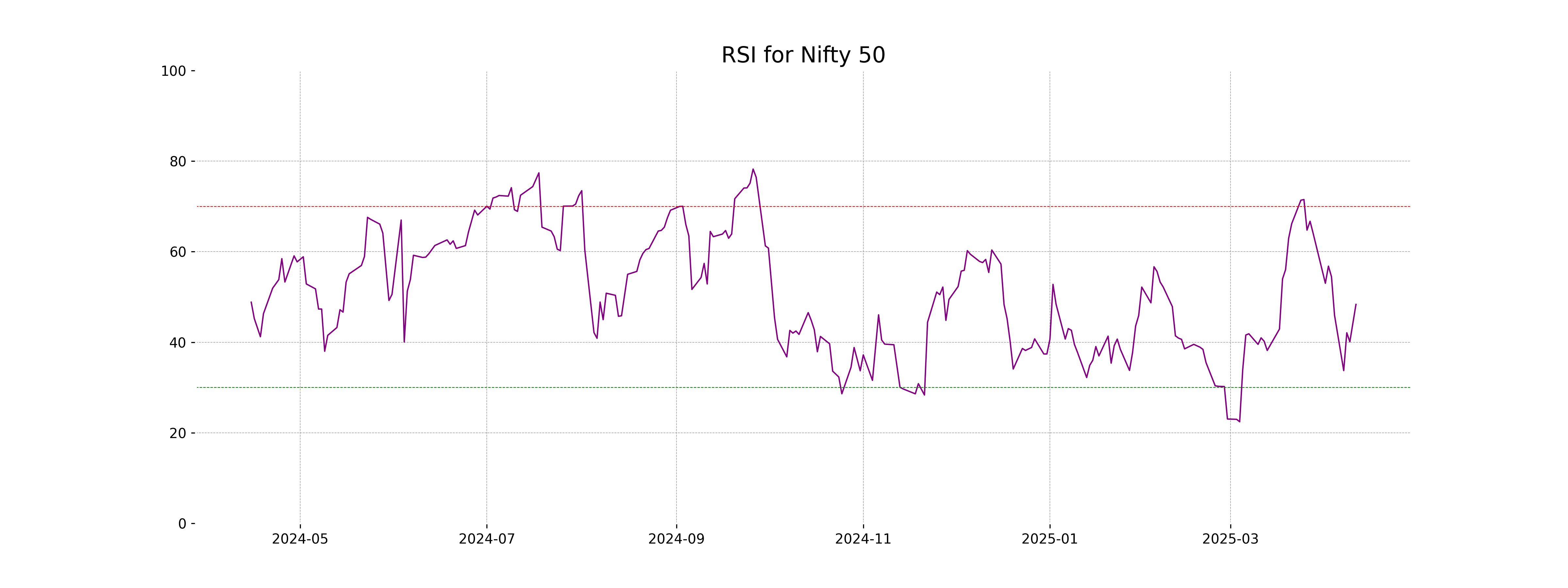 Nifty 50 RSI Analysis: The Relative Strength Index (RSI) for Nifty 50 is at 48.35, indicating that it is in the neutral zone. This suggests a balanced sentiment in the market without being overbought or oversold. Investors may look for a more decisive RSI move for stronger directional cues.