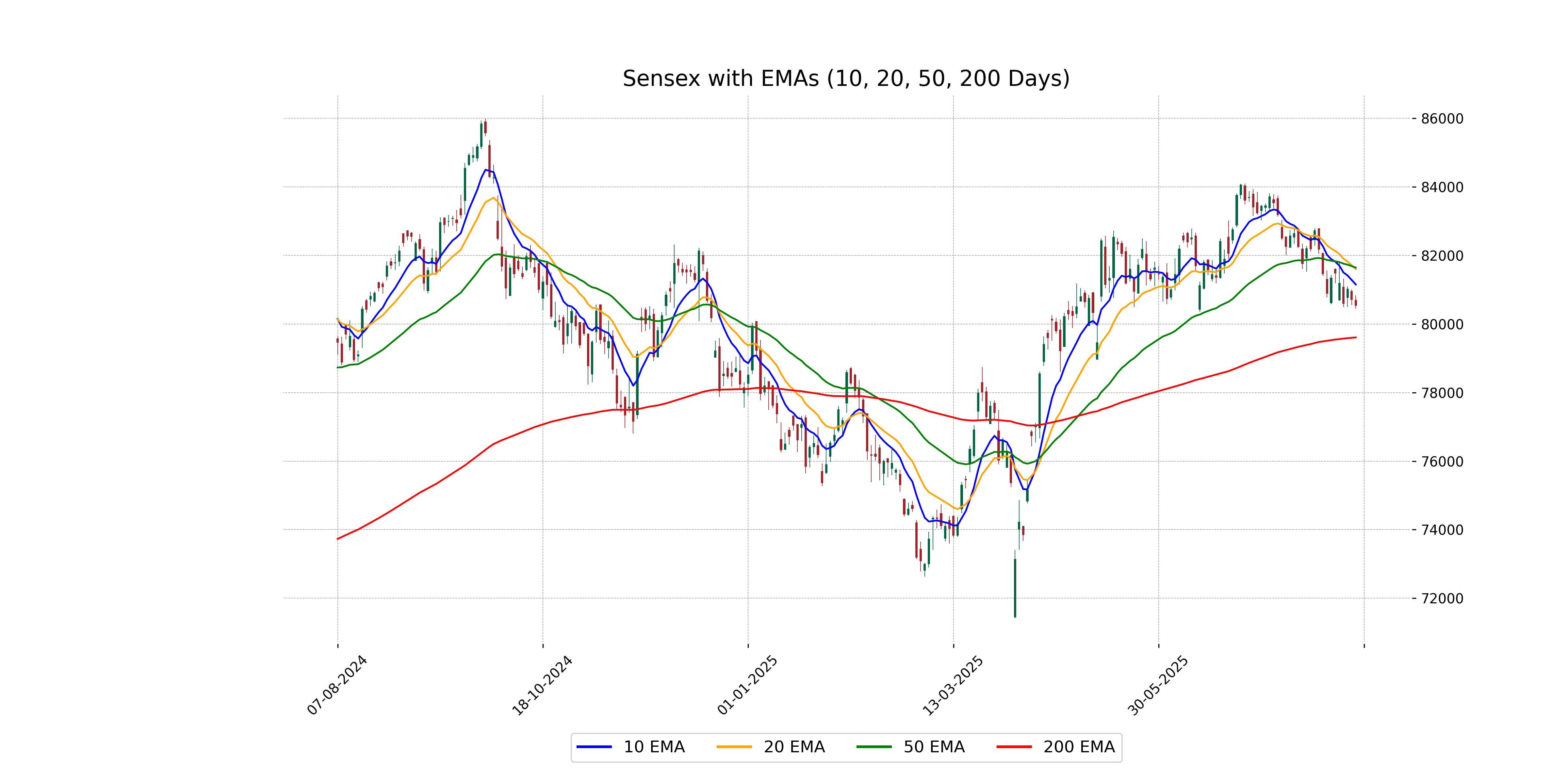 The Sensex closed at 80543.99, which is below the 50 EMA of 81644.75 and the 10 EMA of 81151.15, indicating a bearish trend. It is, however, slightly above the 200 EMA of 79606.99, suggesting some long-term support might still be present.