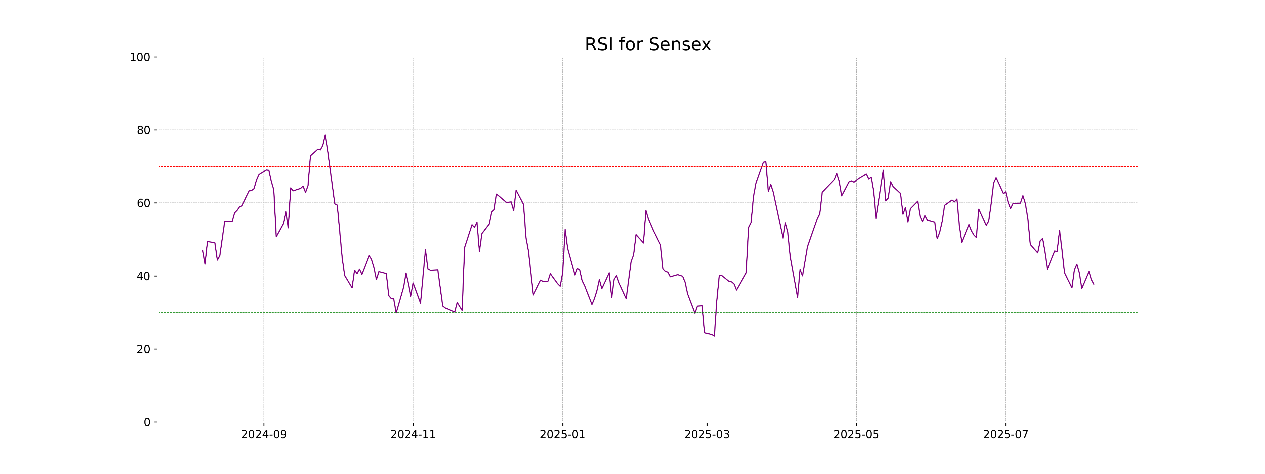 The RSI for Sensex stands at approximately 37.74, indicating that the index is nearing the oversold region, which is typically below 30. This suggests potential undervaluation or waning momentum, indicating a possibility of a bullish reversal if buying interest increases.