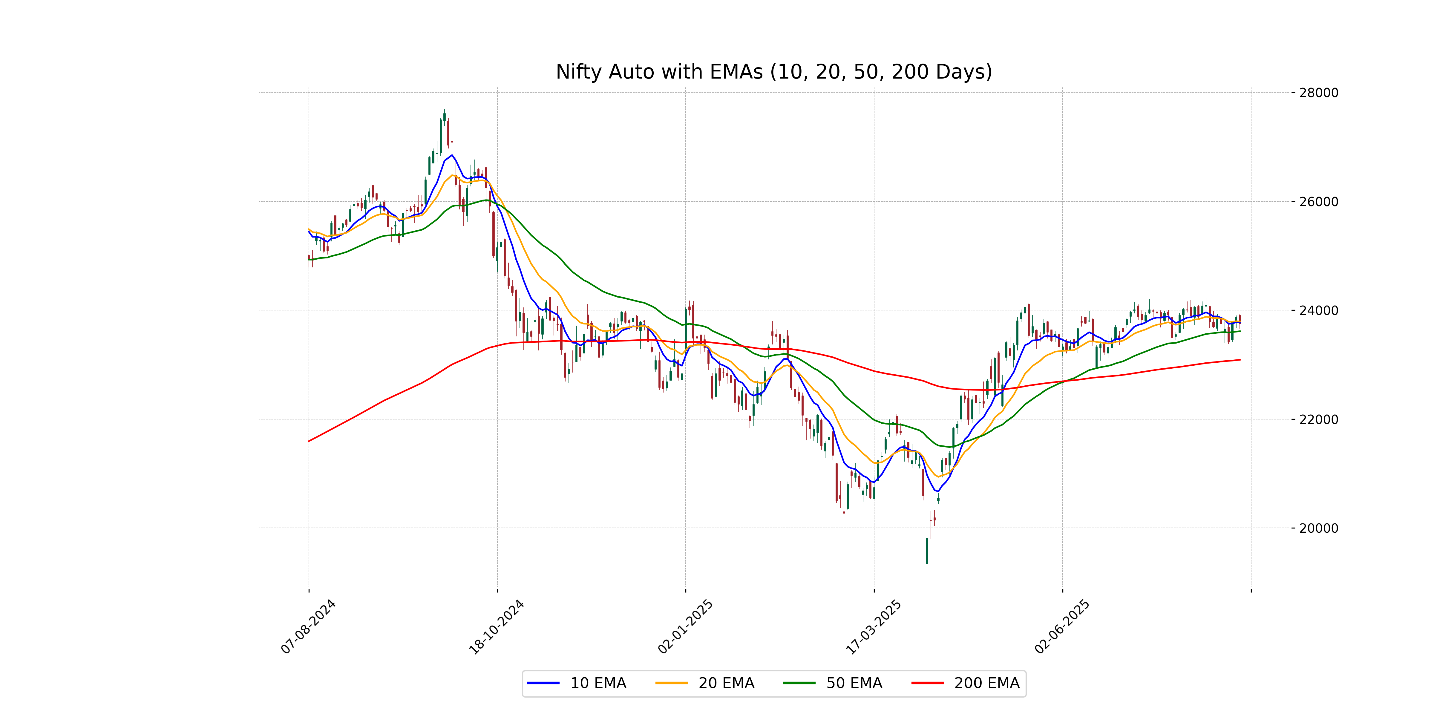 The closing price of Nifty Auto is 23748.85, which is above its 50-day EMA of 23612.71, but below both its 10-day EMA of 23771.91 and 20-day EMA of 23791.44. This indicates that while the short-term trend is slightly bearish, the long-term trend remains bullish.