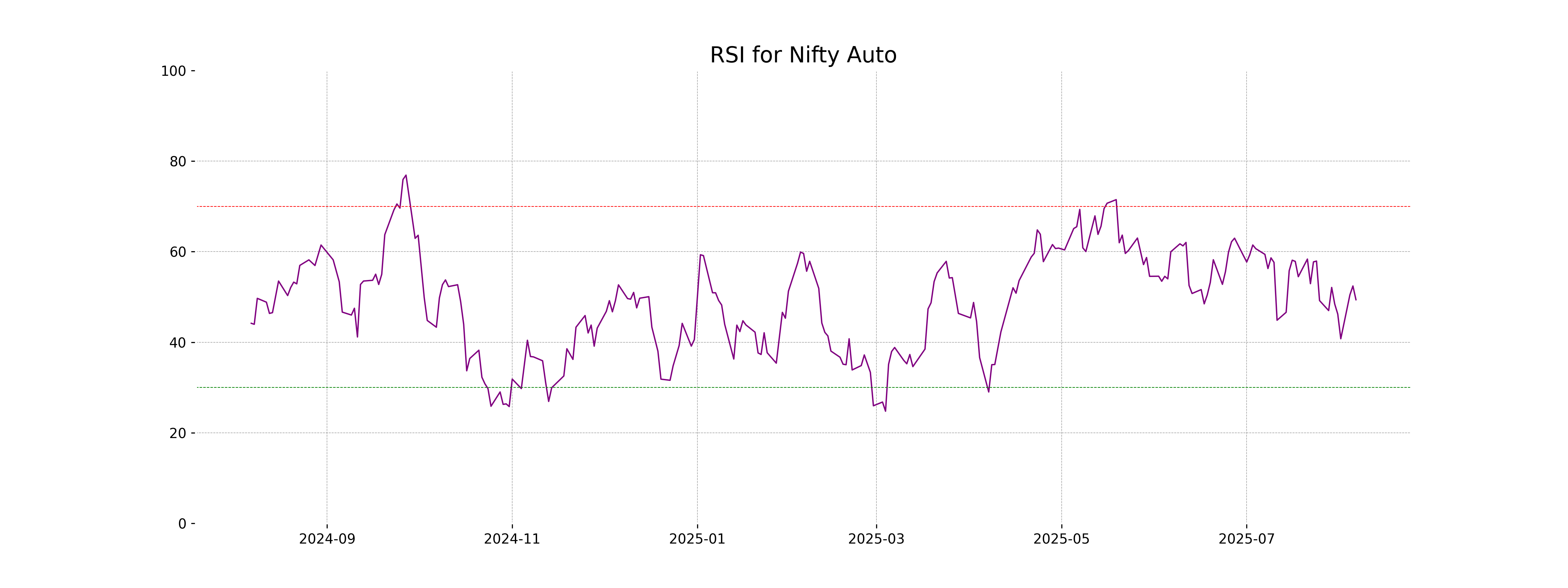 The RSI value for Nifty Auto is 49.38, which indicates that the stock is neither overbought nor oversold. An RSI near 50 generally suggests a neutral market sentiment and potential consolidation.