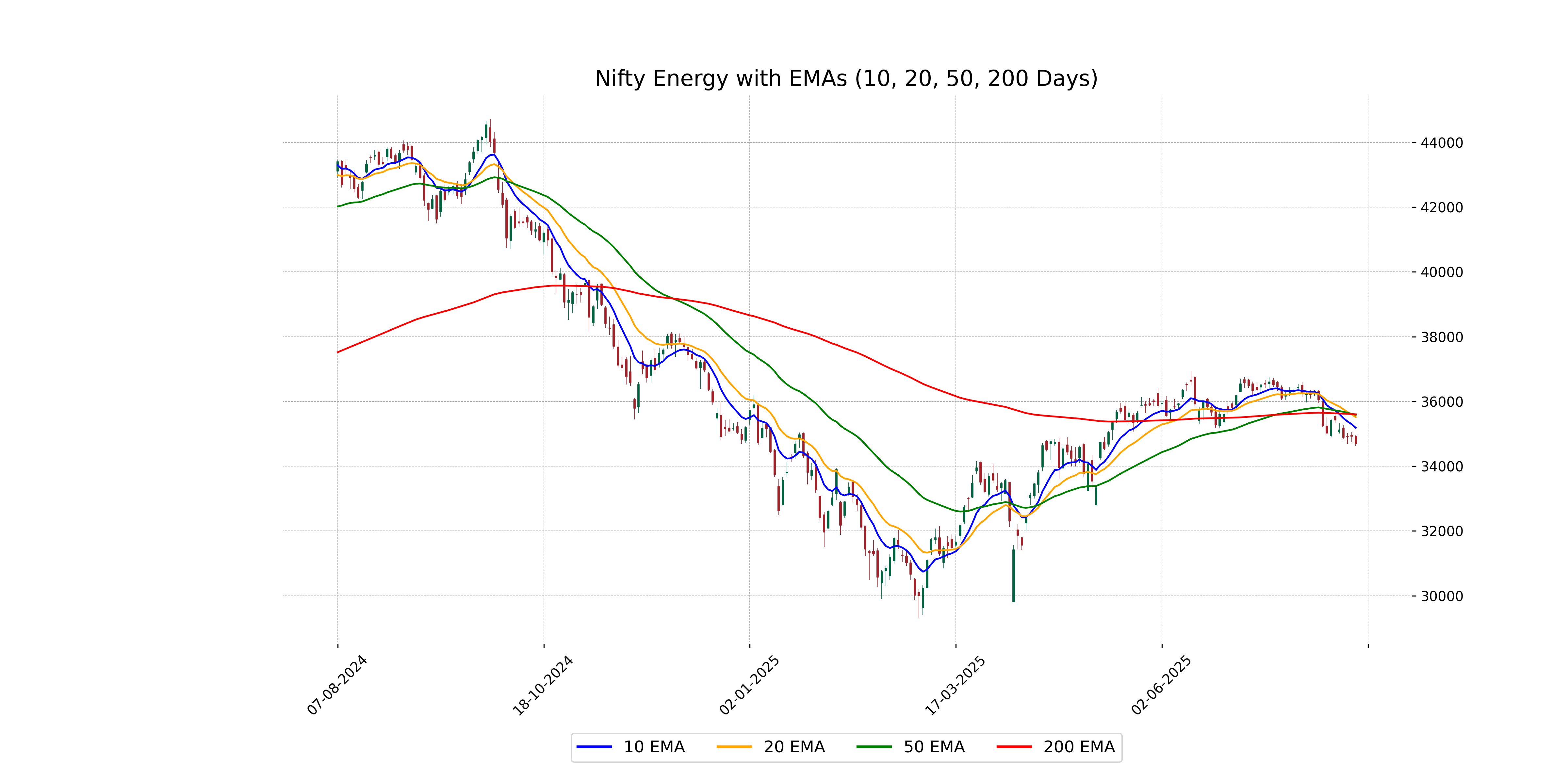 The Nifty Energy index closed at 34,683.35, which is below the 10-day EMA of 35,184.54, 20-day EMA of 35,513.53, 50-day EMA of 35,584.18, and 200-day EMA of 35,601.95. This suggests a bearish trend as the current price is below all key moving averages.