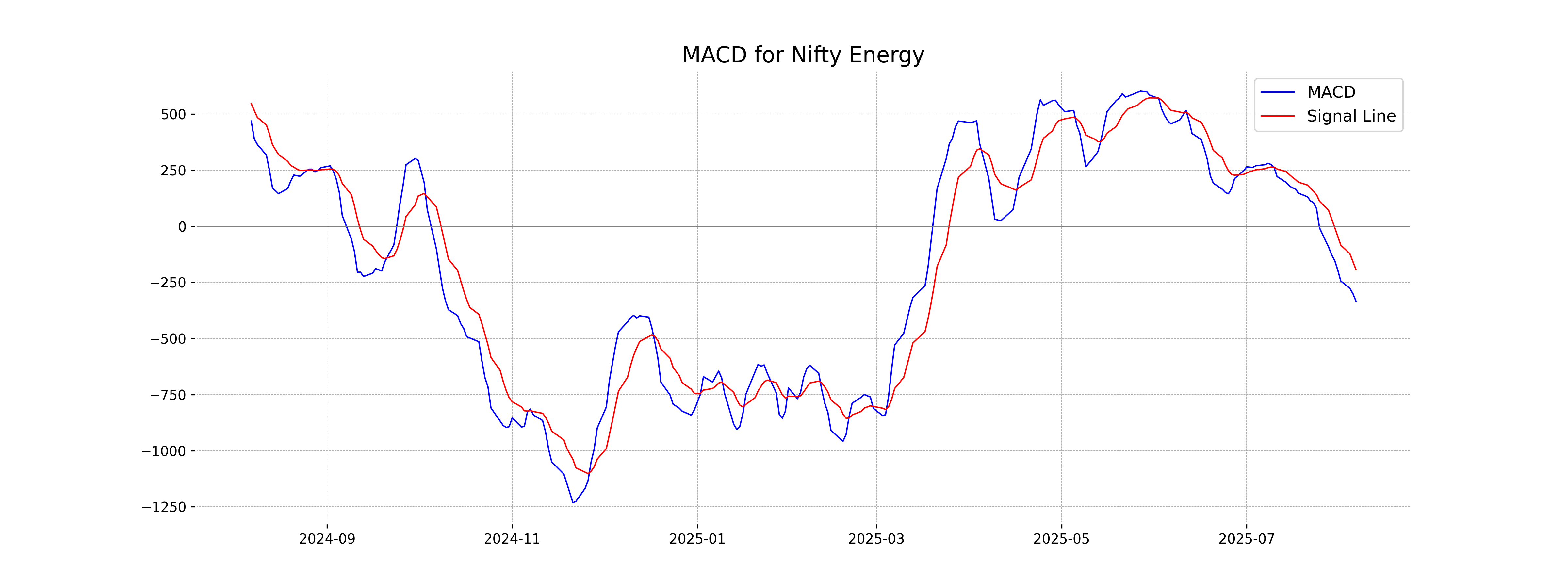 MACD Analysis for Nifty Energy: The MACD value of -333.32 indicates a bearish momentum, as it is significantly below the signal line at -192.95. With the MACD being negative and lower than the signal line, it suggests a strong downward trend in the Nifty Energy index.