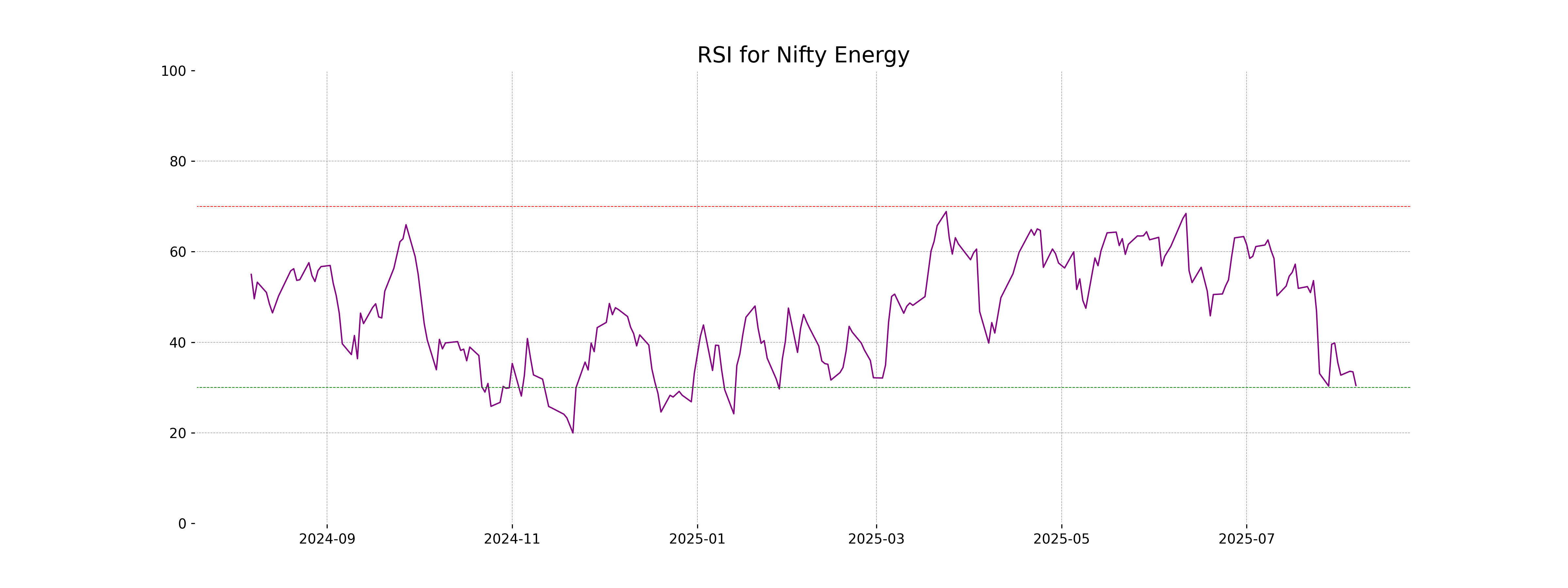 The RSI for Nifty Energy stands at 30.45, indicating that the index is approaching the oversold territory. This suggests potential buying interest might emerge if the RSI continues to drop further below 30, although caution is advised due to prevailing market conditions.