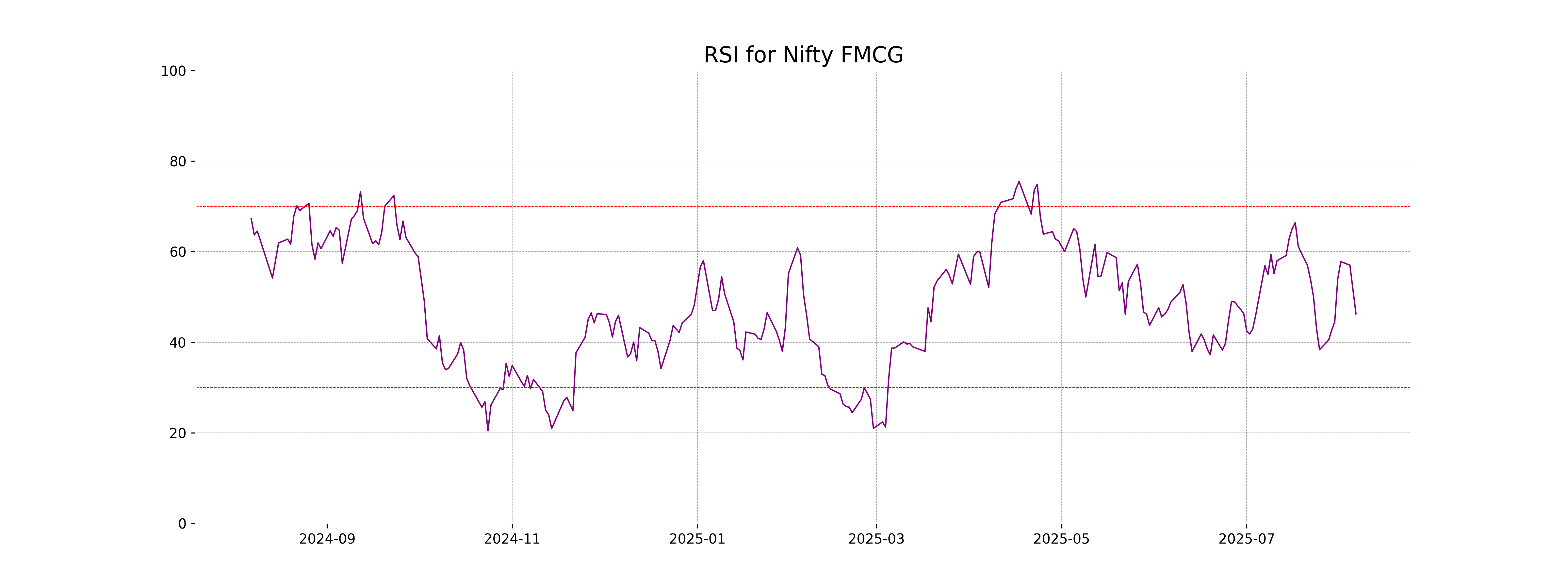 Based on the provided data, Nifty FMCG has an RSI of 46.28. An RSI below 50 typically indicates weakening momentum, suggesting that the index might be exhibiting bearish tendencies or is currently underperforming. However, it is not yet in the oversold territory, which is generally below 30.