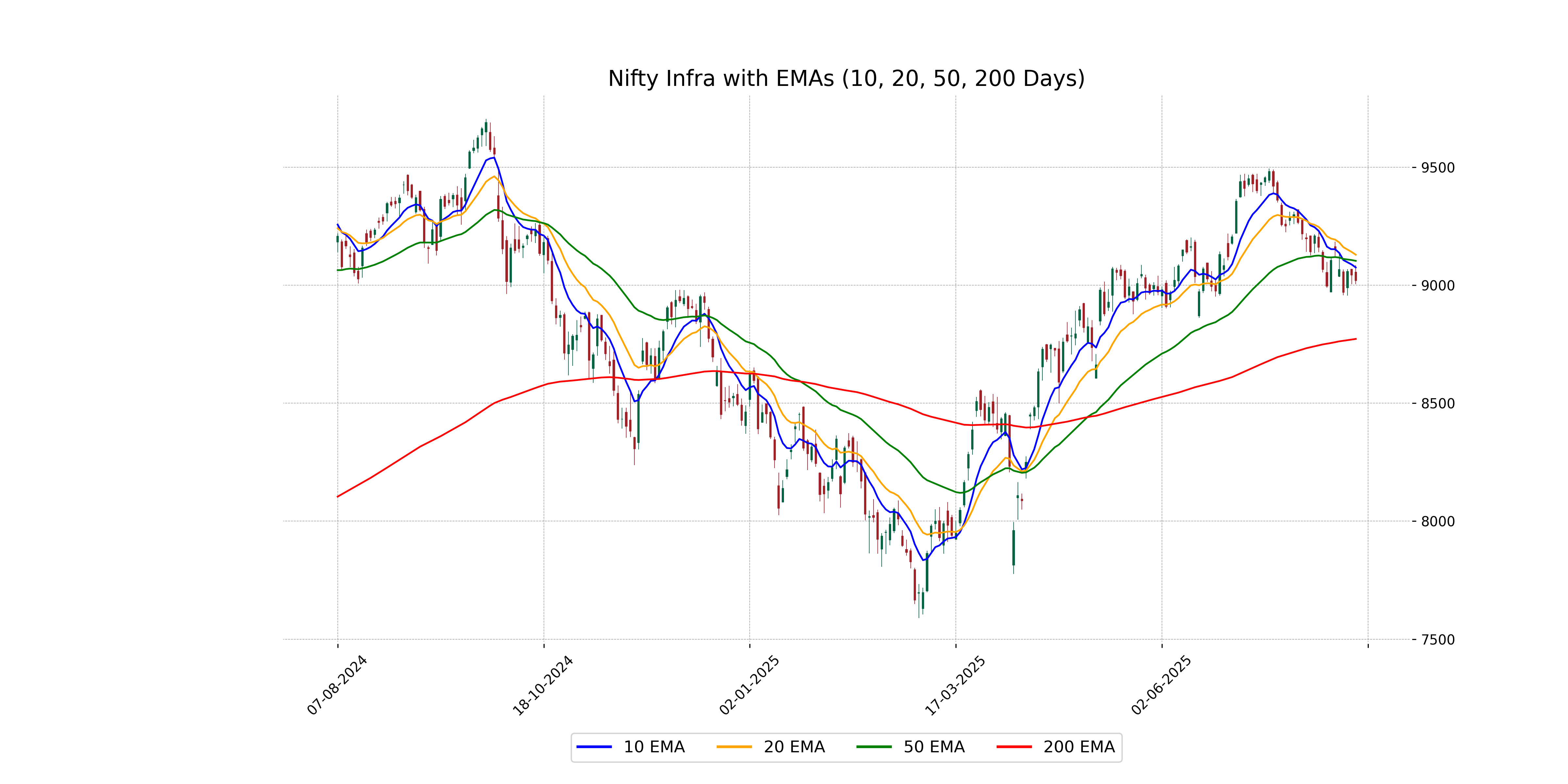 Nifty Infra closed at 9018.80, which is below its 10-day EMA of 9075.18 and its 50-day EMA of 9103.16, indicating short-term and medium-term bearishness. It is above its 200-day EMA of 8772.31, suggesting long-term bullishness.