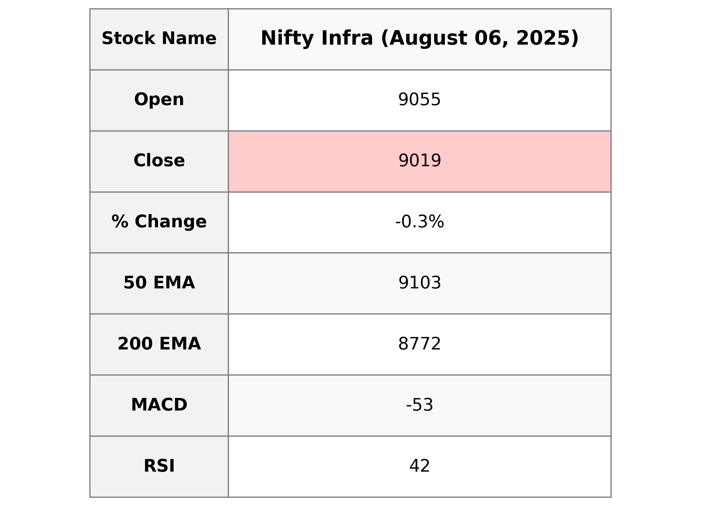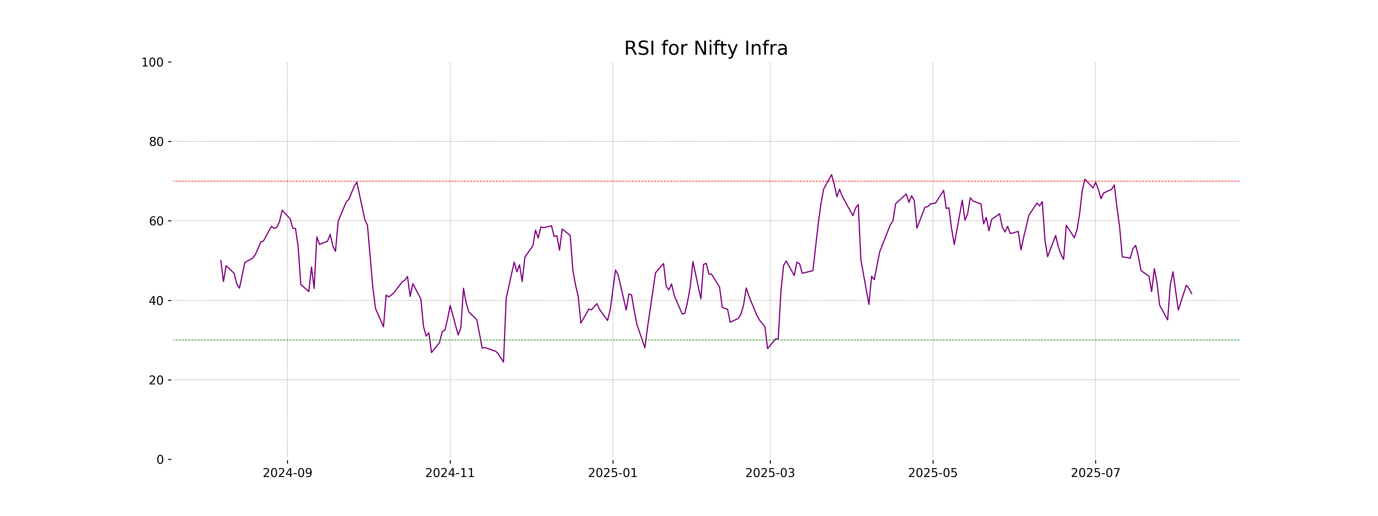 The RSI (Relative Strength Index) for Nifty Infra is 41.70, which indicates that the index is in a neutral zone. It is not currently overbought or oversold, suggesting a balanced momentum in the market.