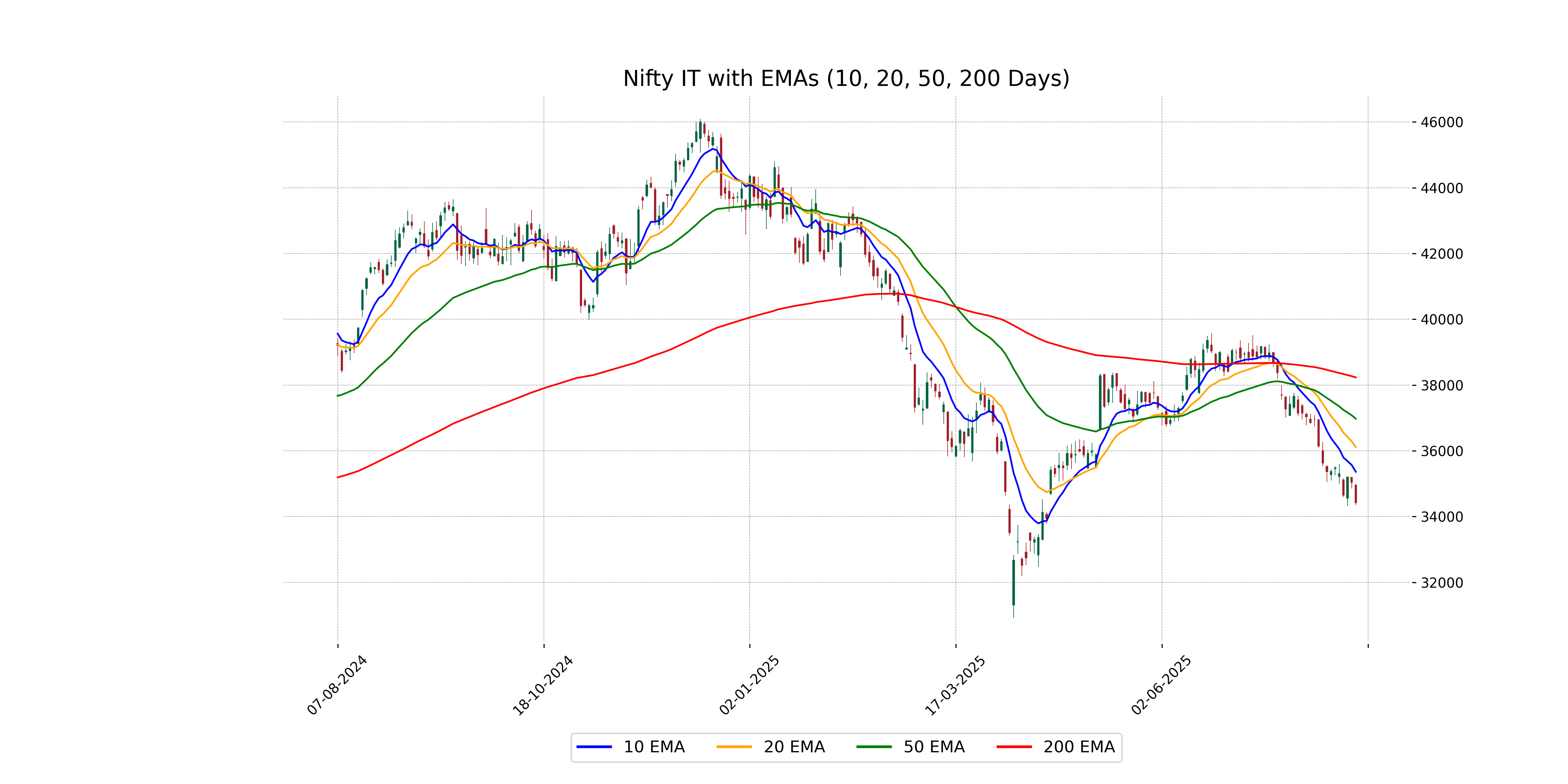 The closing price of Nifty IT at 34,426.25 is below key moving averages, specifically the 50 EMA at 36,976.84 and the 200 EMA at 38,232.42, indicating potential bearish pressure. Additionally, the 10 EMA and 20 EMA are also higher than the current close, suggesting a short-term downtrend.