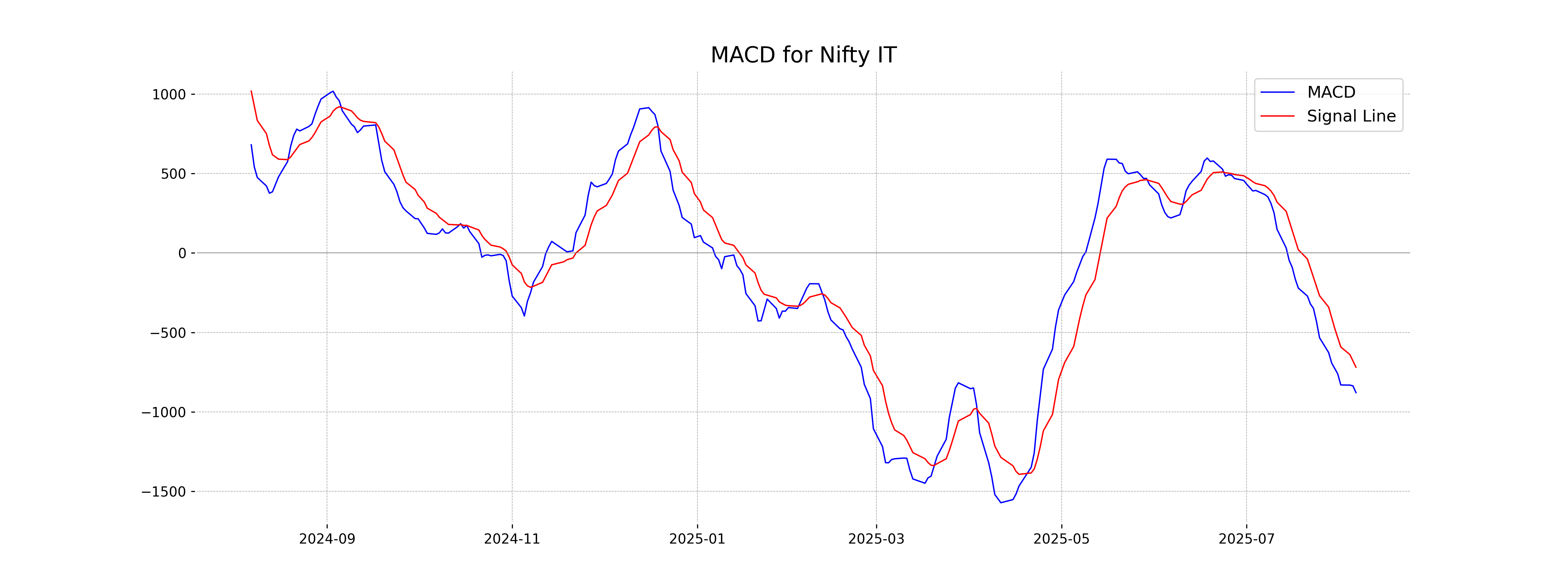 Nifty IT is currently experiencing a bearish trend, as indicated by the MACD value of -878.65, which is well below both the MACD Signal line and zero. This suggests negative momentum and potential further downside unless there is a significant reversal in the market.