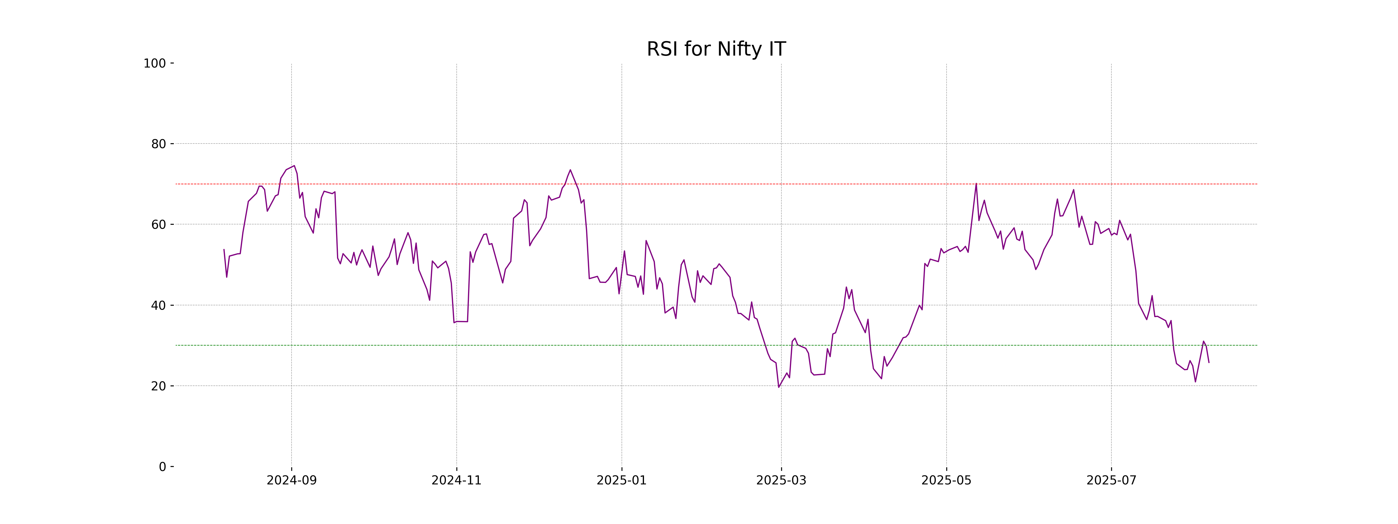 Based on the data, the RSI (Relative Strength Index) for Nifty IT stands at 25.76, which indicates the index is in the oversold territory. This suggests potential for a price reversal or a bounce-back in the near-term, as the RSI value is below the common oversold threshold of 30.