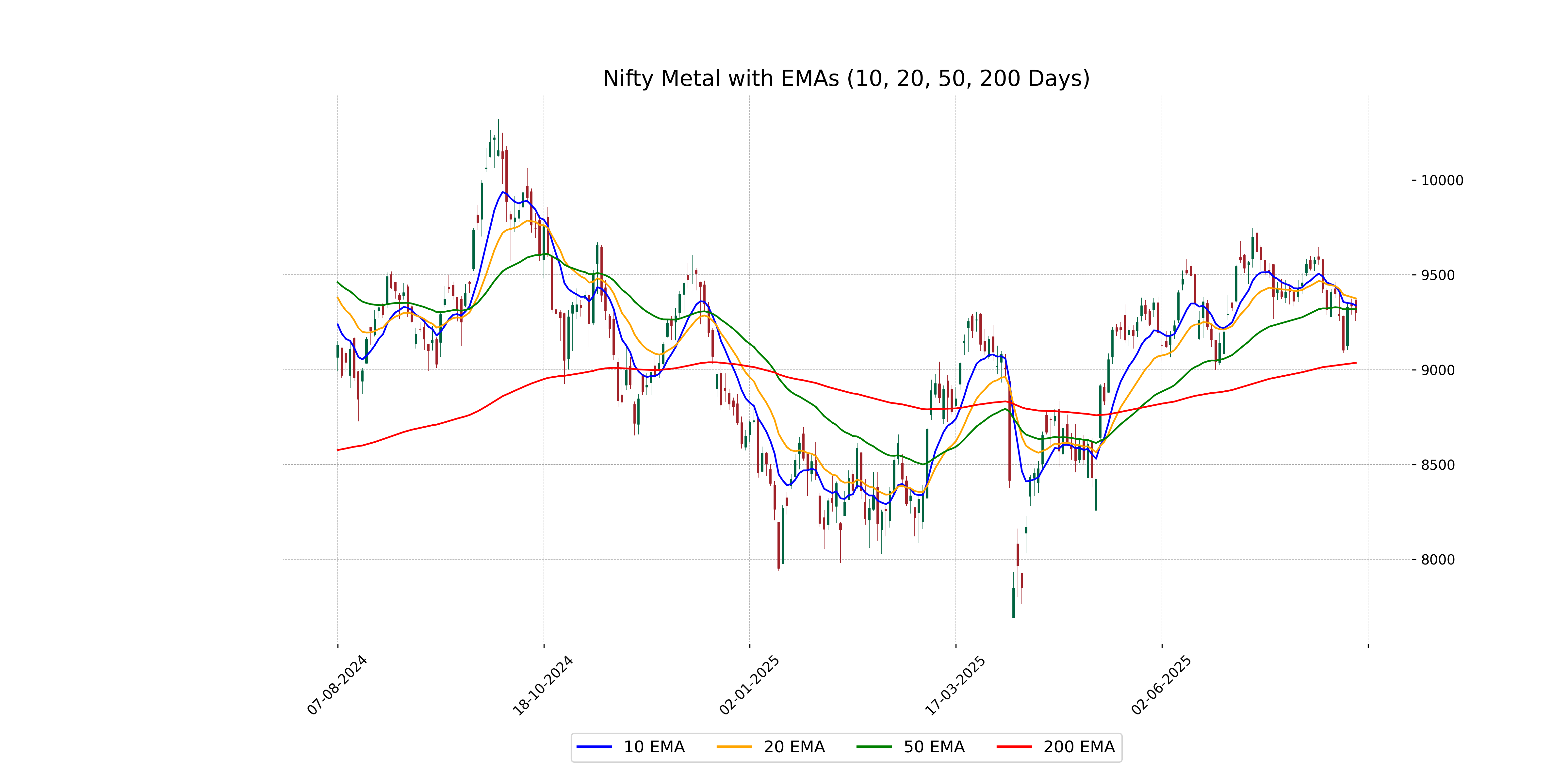 The Nifty Metal index closed below its 10-day and 20-day EMAs, indicating short-term bearish momentum, as well as below the 50-day EMA, suggesting ongoing pressure. The index remains above the 200-day EMA, signifying a long-term bullish trend.