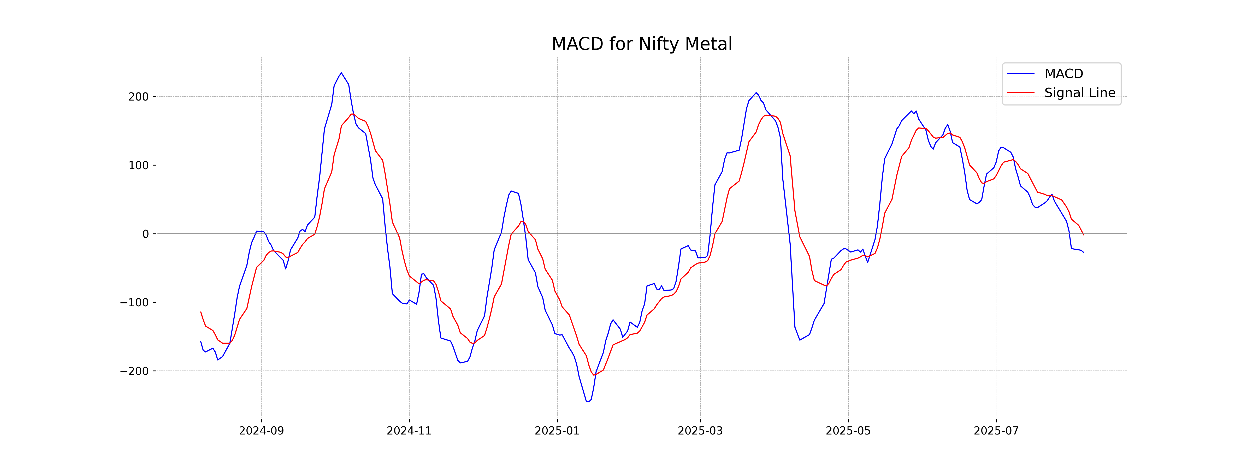 The MACD for Nifty Metal is at -27.32 with a signal line of -1.58, indicating a bearish momentum. The negative MACD value suggests that the recent price declines have potentially accelerated, emphasizing a need for caution among traders.