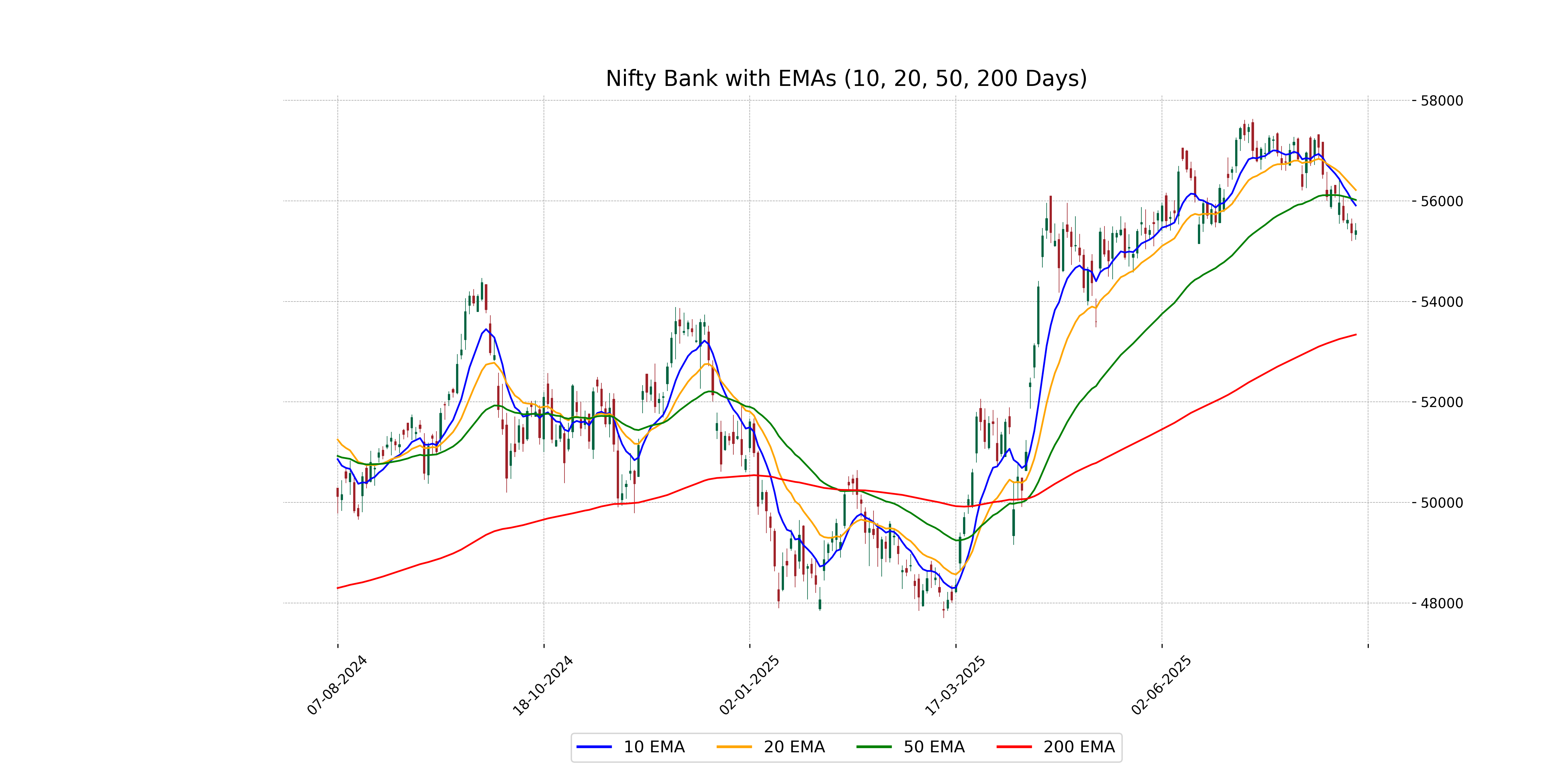 The closing price of Nifty FMCG at 55230.80 is currently below its 50-day EMA of 55499.67, 10-day EMA of 55585.36, and 20-day EMA of 55571.27, indicating a bearish trend. Additionally, the 200-day EMA at 55889.84 is also above the current closing price, reinforcing the downward movement relative to key moving averages.