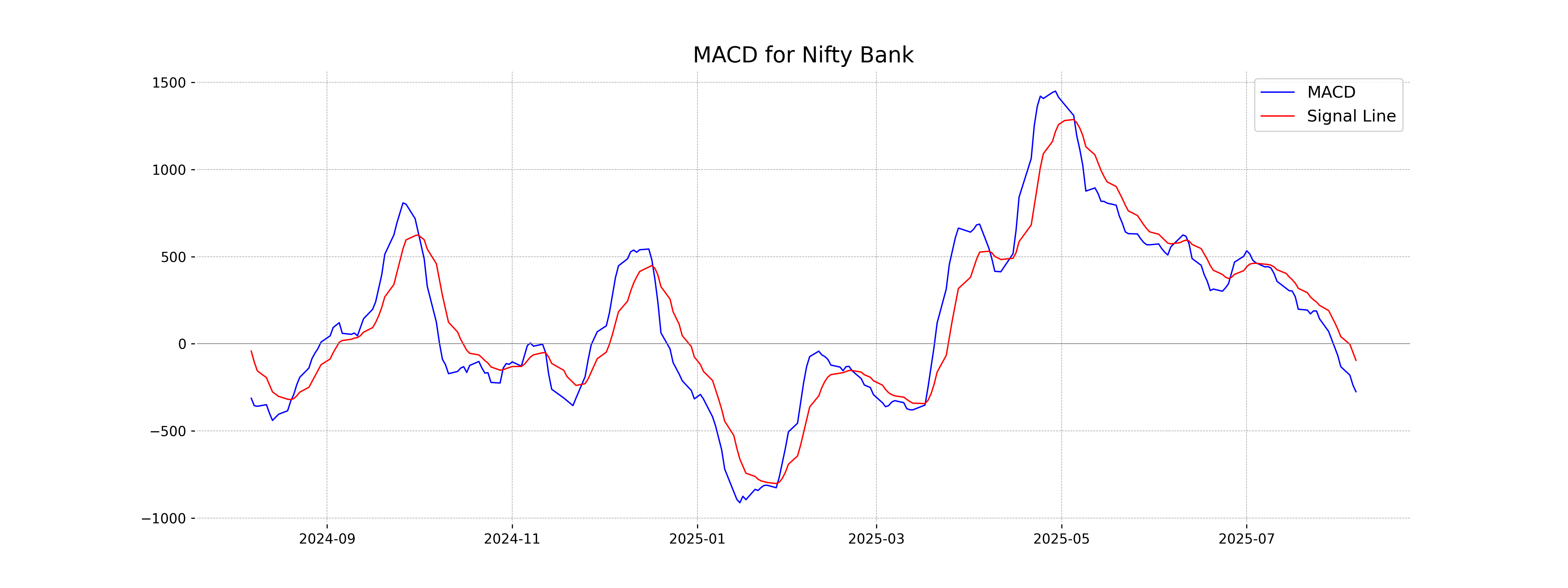 MACD Analysis for Nifty Bank: The MACD value of -274.58, which is significantly below its signal line of -94.68, suggests a strong bearish trend. This indicates potential continued downward momentum in the Nifty Bank, as the MACD is in a negative territory pointing towards increased selling pressure.