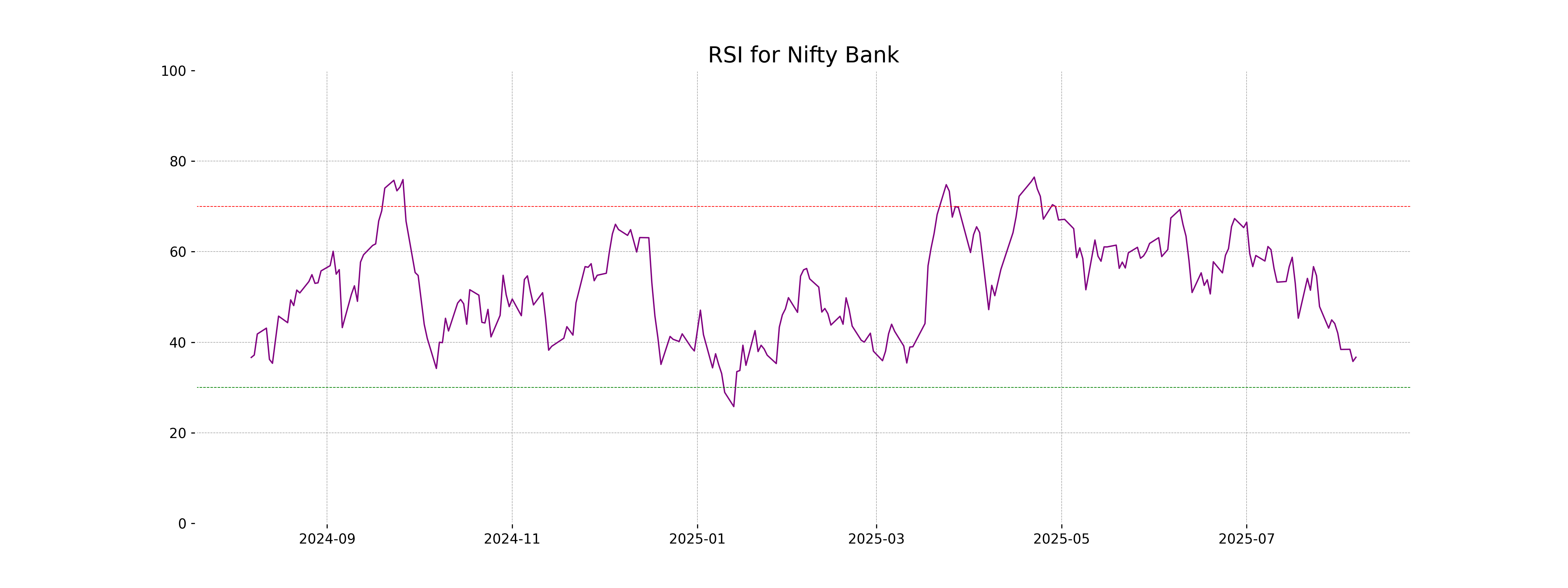 Nifty Bank's RSI is at 36.68, indicating that the index is nearing oversold conditions. This suggests potential for a reversal or bounce, as RSI levels below 30 typically indicate oversold opportunities. However, it's important to consider other indicators in conjunction with RSI for a comprehensive analysis.