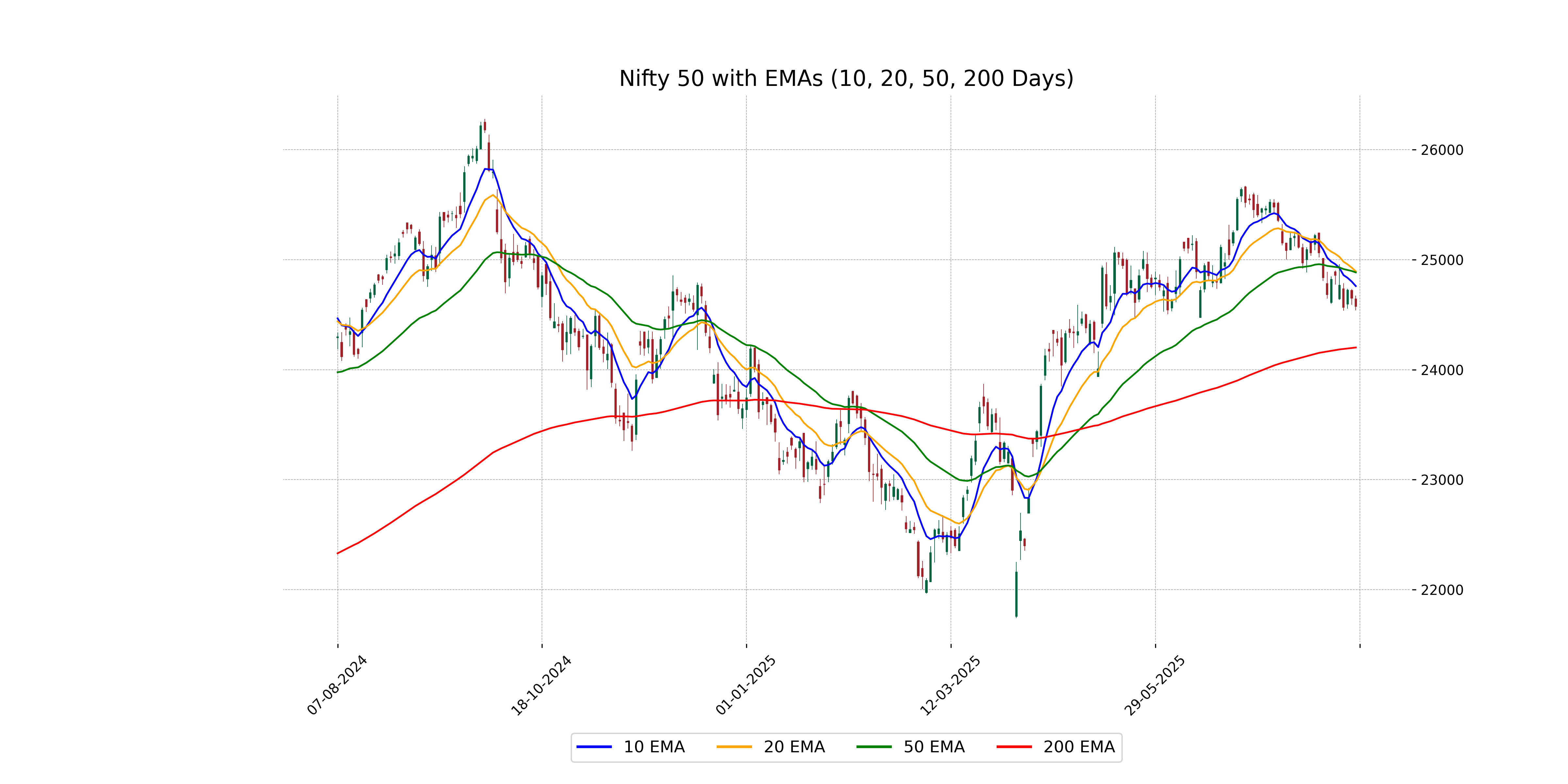 The Nifty 50 closed at 24,574.20, which is below all its key moving averages with the 50 EMA at 24,883.75, the 10 EMA at 24,759.27, and the 20 EMA at 24,893.40, indicating a bearish trend. The position of the price relative to these EMAs suggests potential downward momentum.