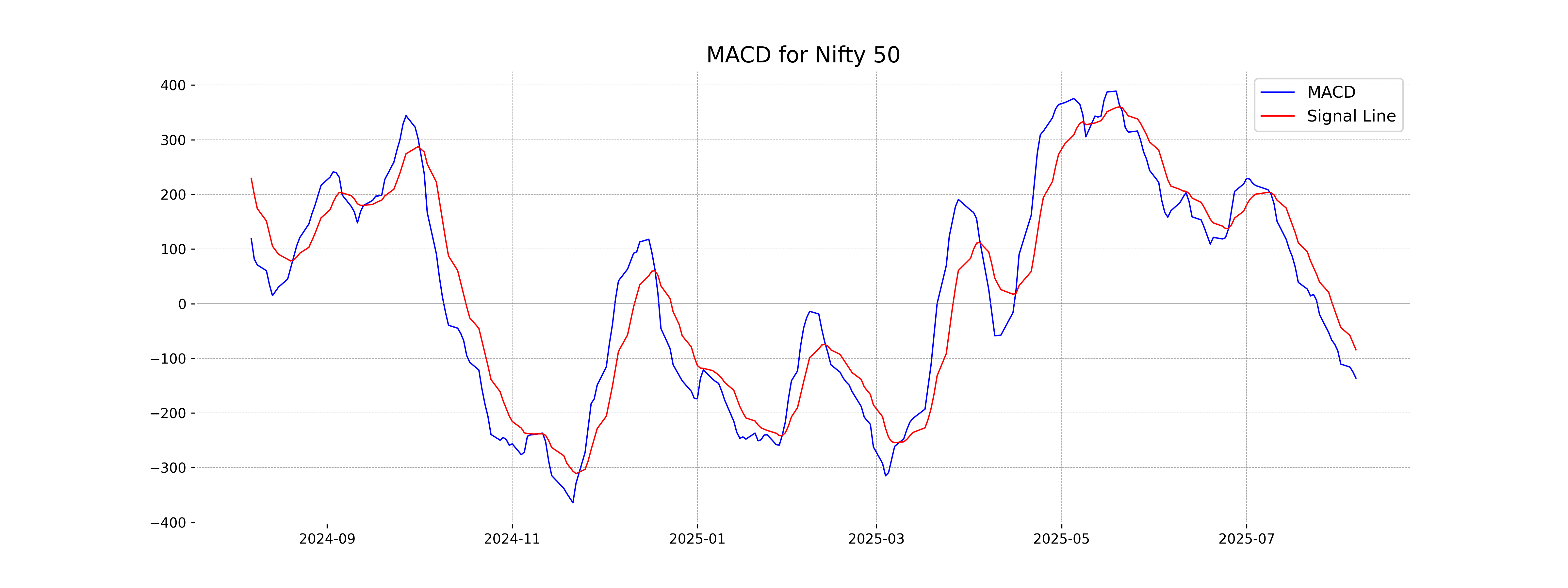 The MACD analysis for Nifty 50 indicates a bearish momentum as the MACD line is below the signal line, with a value of -136.23 compared to the signal line at -84.40. This suggests a recent decline in the index's price, accompanied by bearish sentiment.