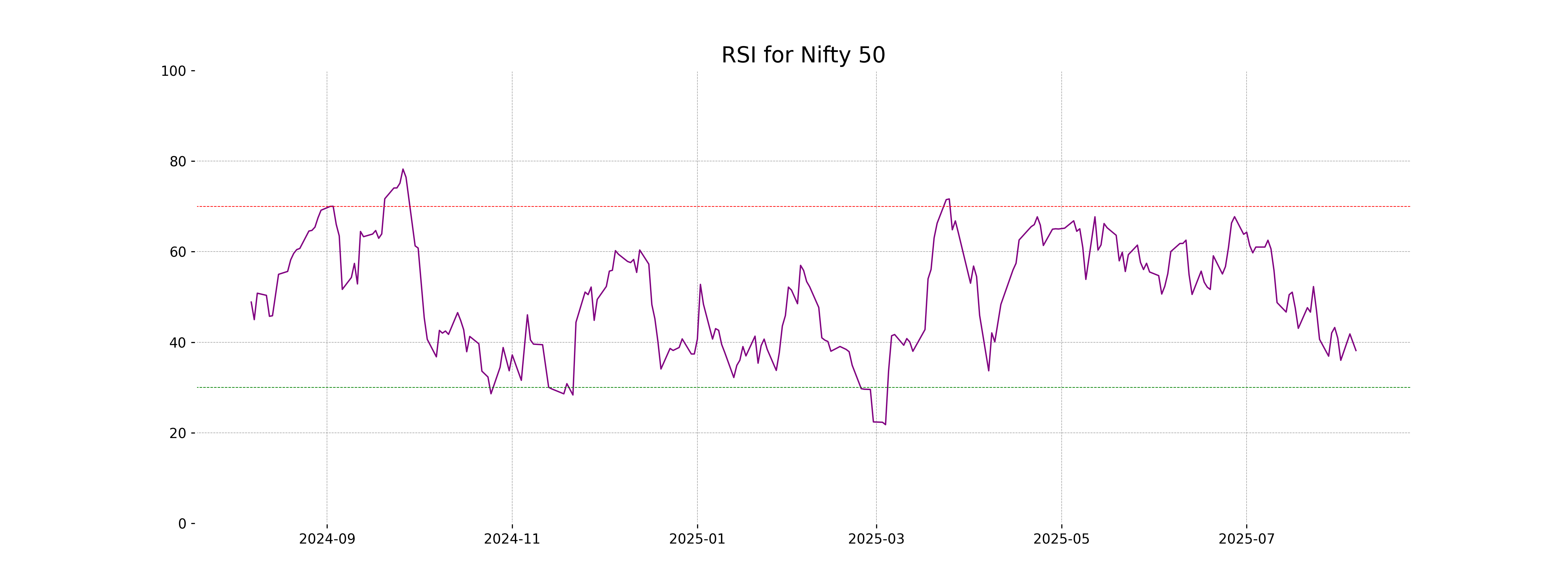 The relative strength index (RSI) for the Nifty 50 is 38.16. An RSI below 40 often suggests that the index is approaching oversold conditions, indicating potential for a price reversal or strengthening after a downward movement.