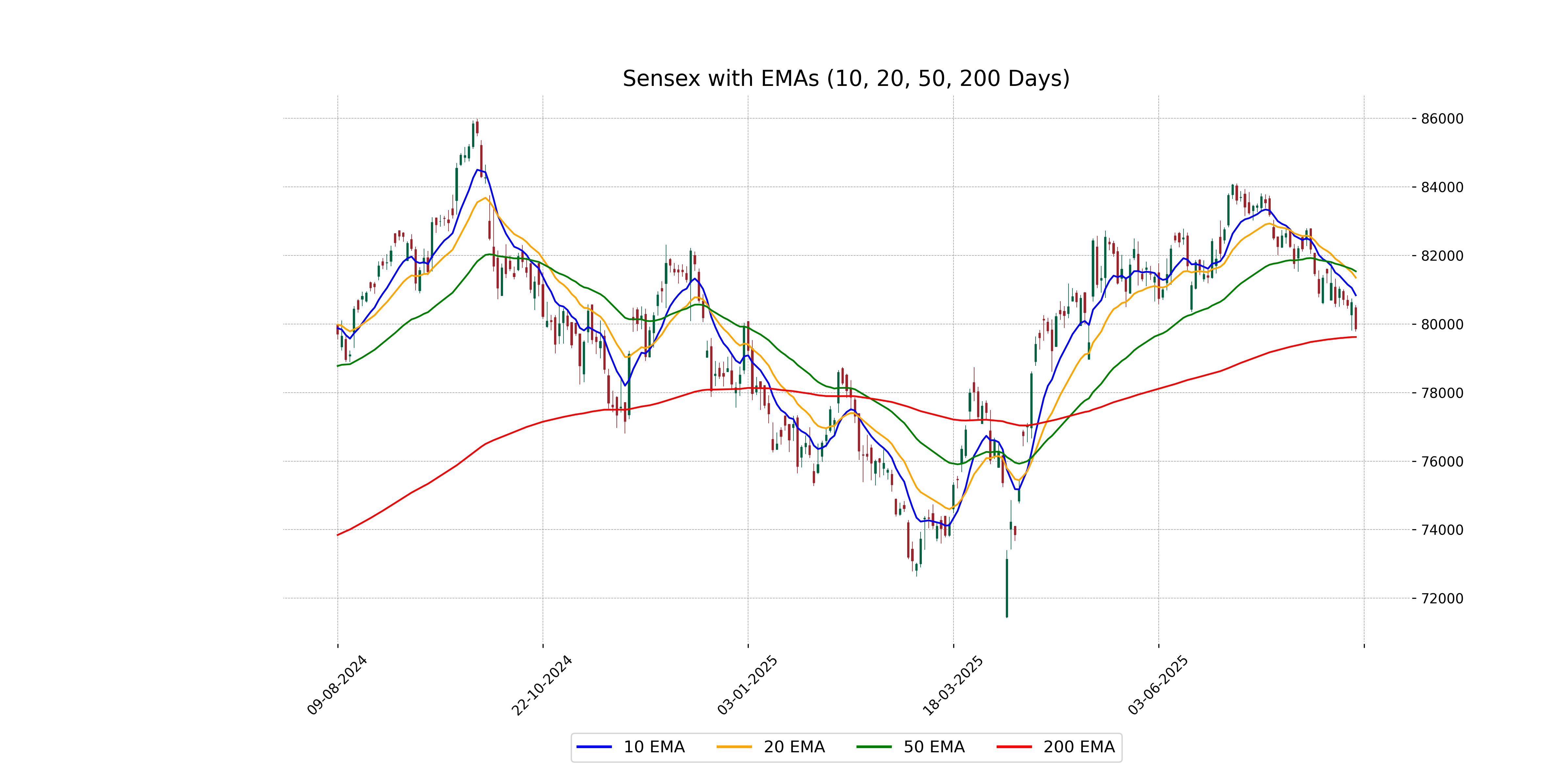 The Sensex closed below its 50-day, 20-day, and 10-day Exponential Moving Averages (EMAs), indicating a bearish trend in the short to medium term. However, it's still slightly above the 200-day EMA, suggesting that the long-term trend has not yet turned bearish. The RSI is also in the lower range, reinforcing the bearish sentiment.