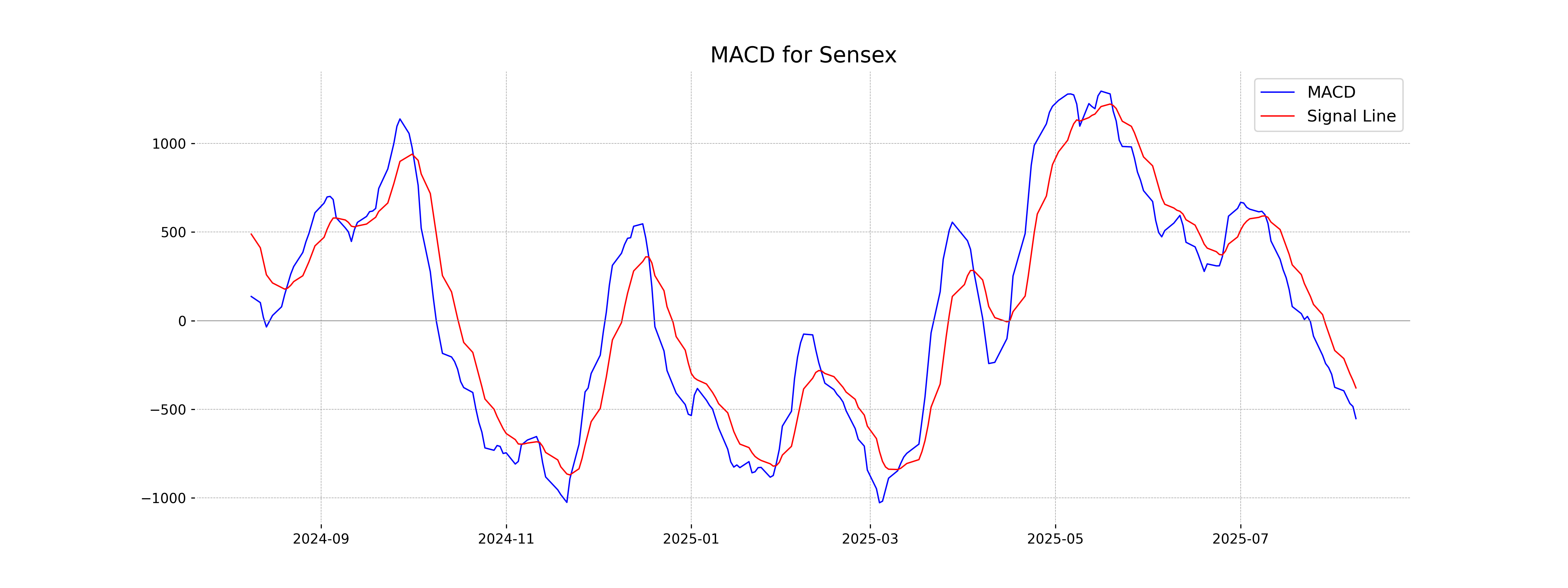 Based on the provided data for the Sensex, the MACD value is -552.67, which is significantly lower than the MACD Signal at -379.54. This negative divergence suggests a bearish trend, indicating potential downward momentum in the Sensex market. The RSI is also relatively low at 33.23, pointing towards possible oversold conditions.
