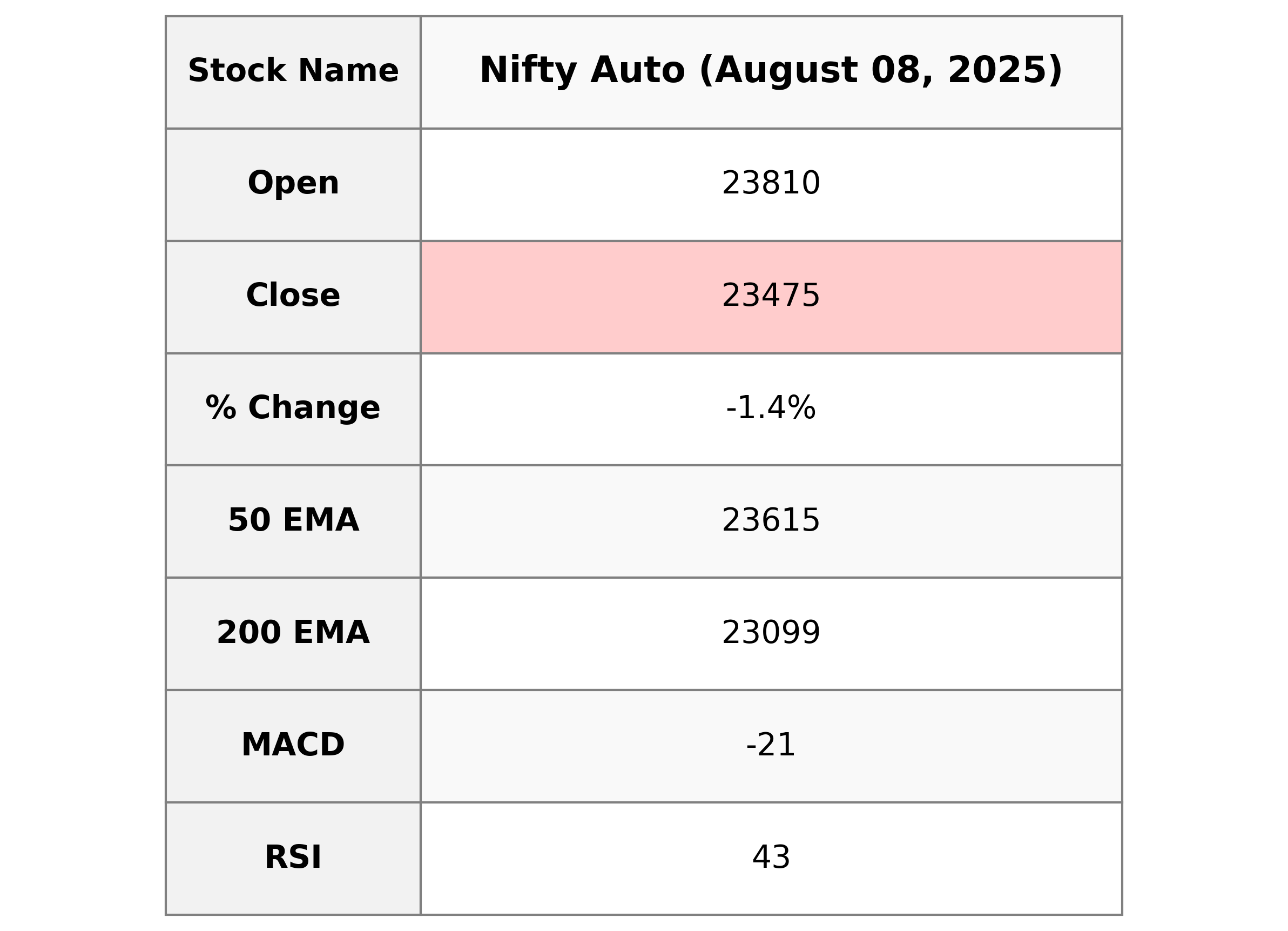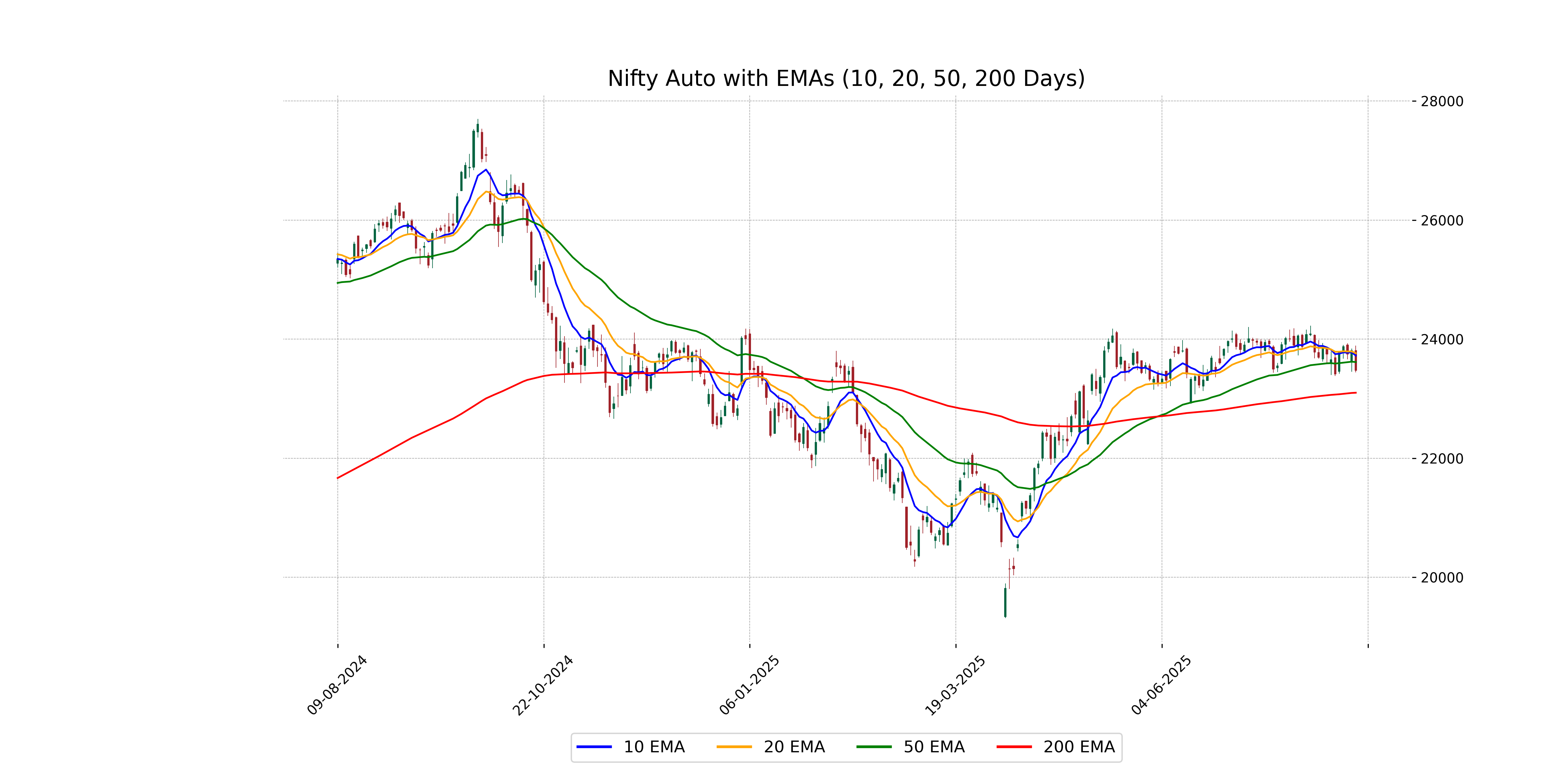 The closing price of Nifty Auto at 23474.65 is below the 50-day EMA of 23614.65, indicating a bearish trend. It is also below the 200-day EMA of 23099.16 but remains near the 10-day EMA and 20-day EMA, suggesting potential volatility or consolidation in the short term. The RSI of 43.39 also supports a neutral to slightly bearish sentiment.