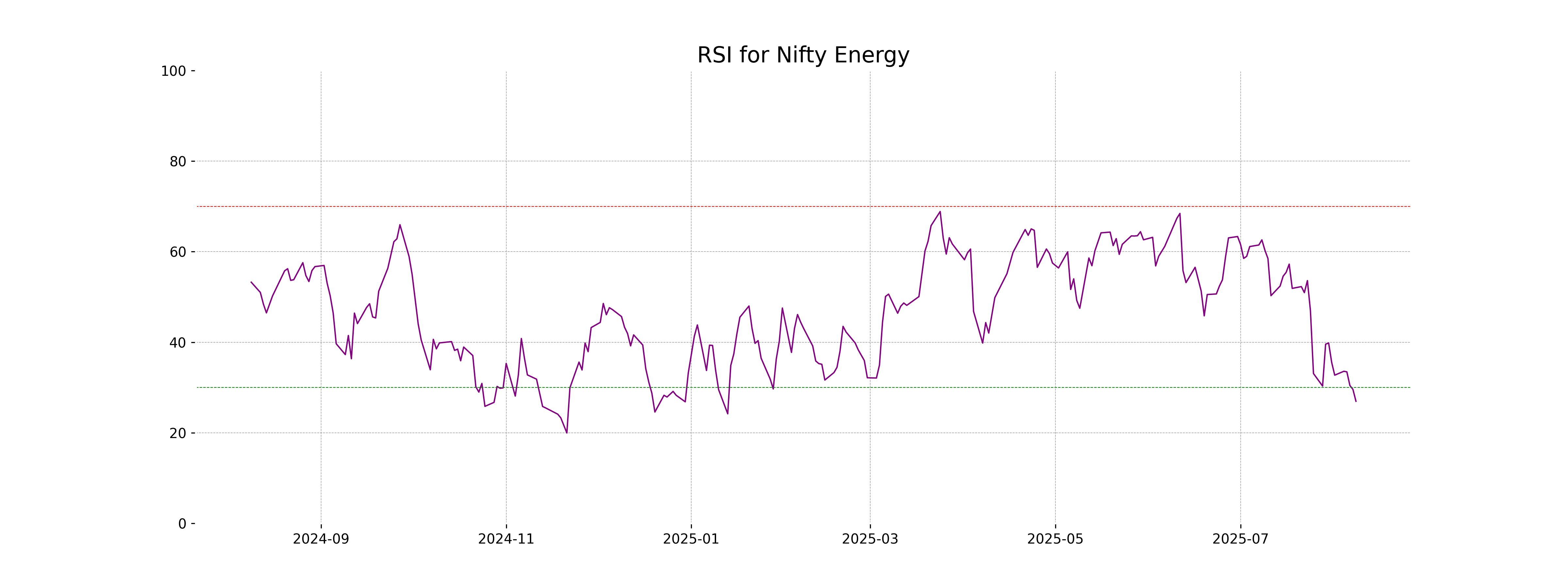 Relative Strength Index (RSI) Analysis for Nifty Energy: The RSI for Nifty Energy is 26.96, indicating that the stock is currently in the oversold territory. This suggests that the stock might be undervalued at the moment, and there could be potential for a price correction or upward movement.