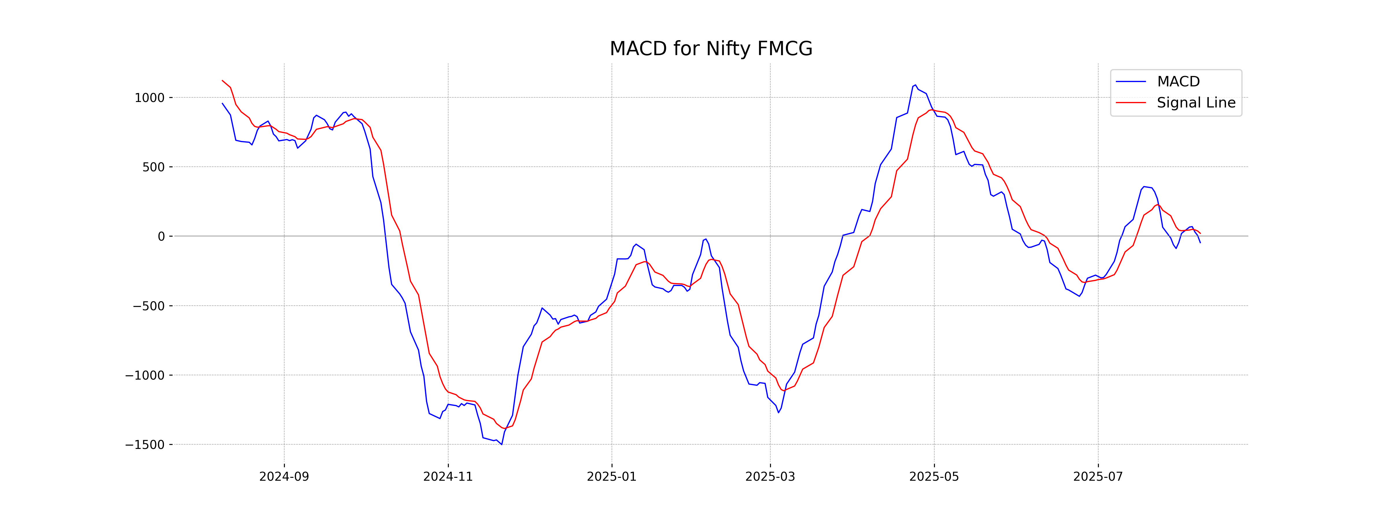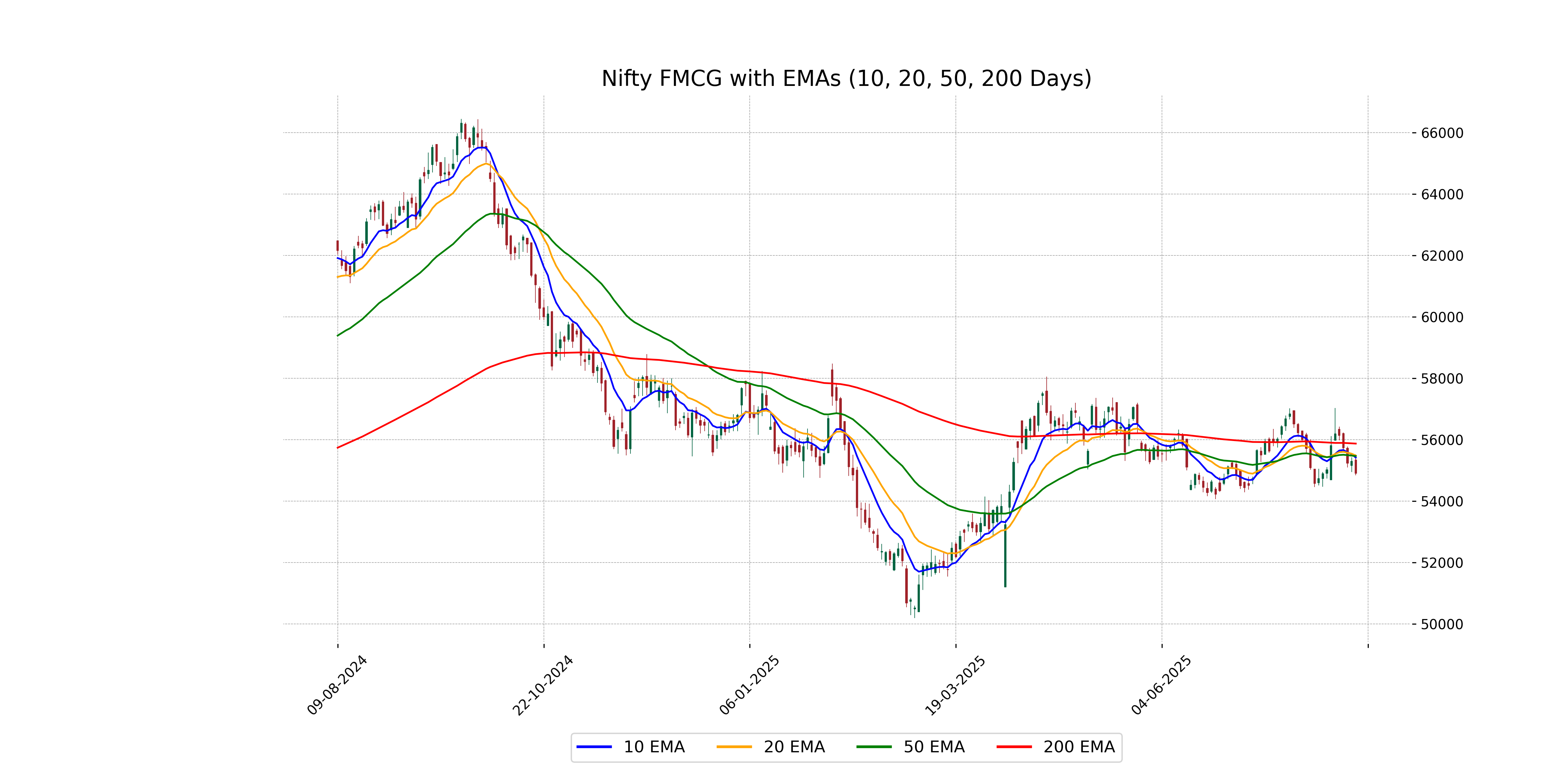 Nifty FMCG Performance: The Nifty FMCG index opened at 55,343.95 and closed lower at 54,900.95, marking a decrease of 0.72% or a 397.55-point drop from its previous close of 55,298.5. The relative strength index (RSI) stands at 42.93, pointing towards weakening momentum in the market, while the MACD is negative at -46.57, signaling bearish conditions. The stock traded below its 50-day, 100-day, and 200-day exponential moving averages, indicating a potential downtrend. High volume data is not available for this stock.
