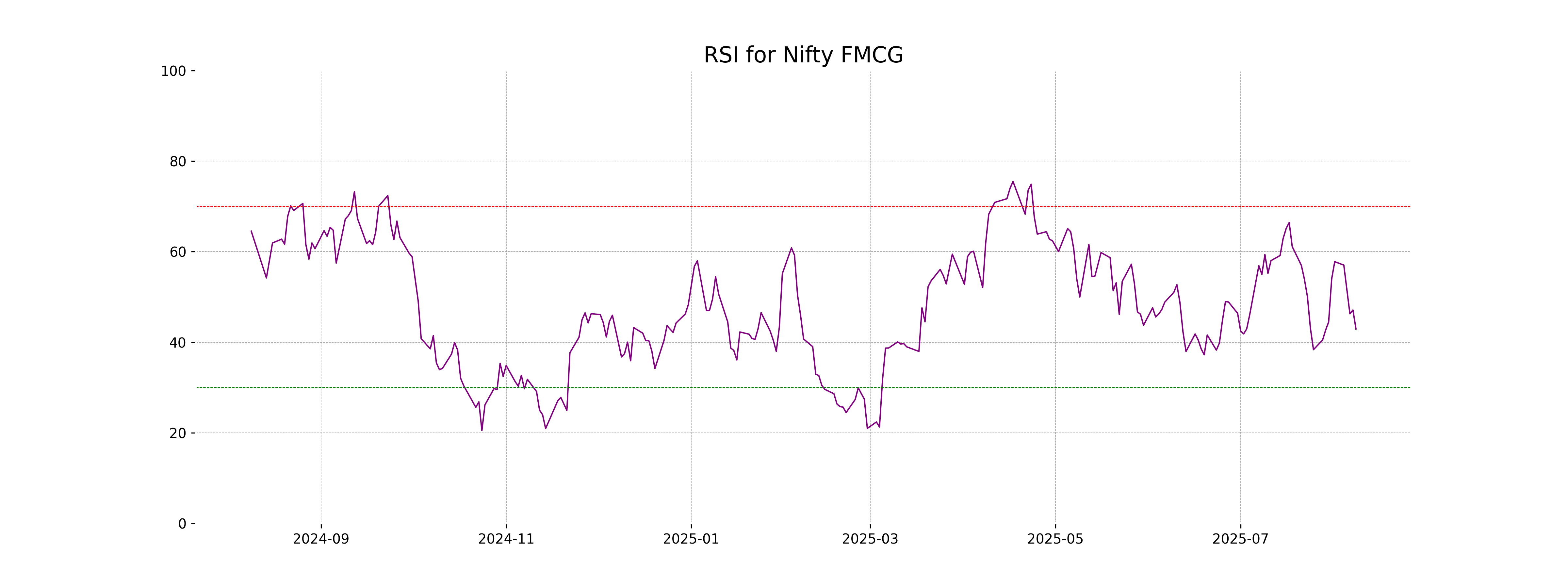 The Relative Strength Index (RSI) for Nifty FMCG is 42.93, suggesting that the stock is currently in a neutral territory and not facing strong overbought or oversold conditions. This level indicates that there might be some bearish momentum, but it's not in the oversold threshold below 30. Traders may want to wait for additional signals before making trading decisions based on RSI alone.