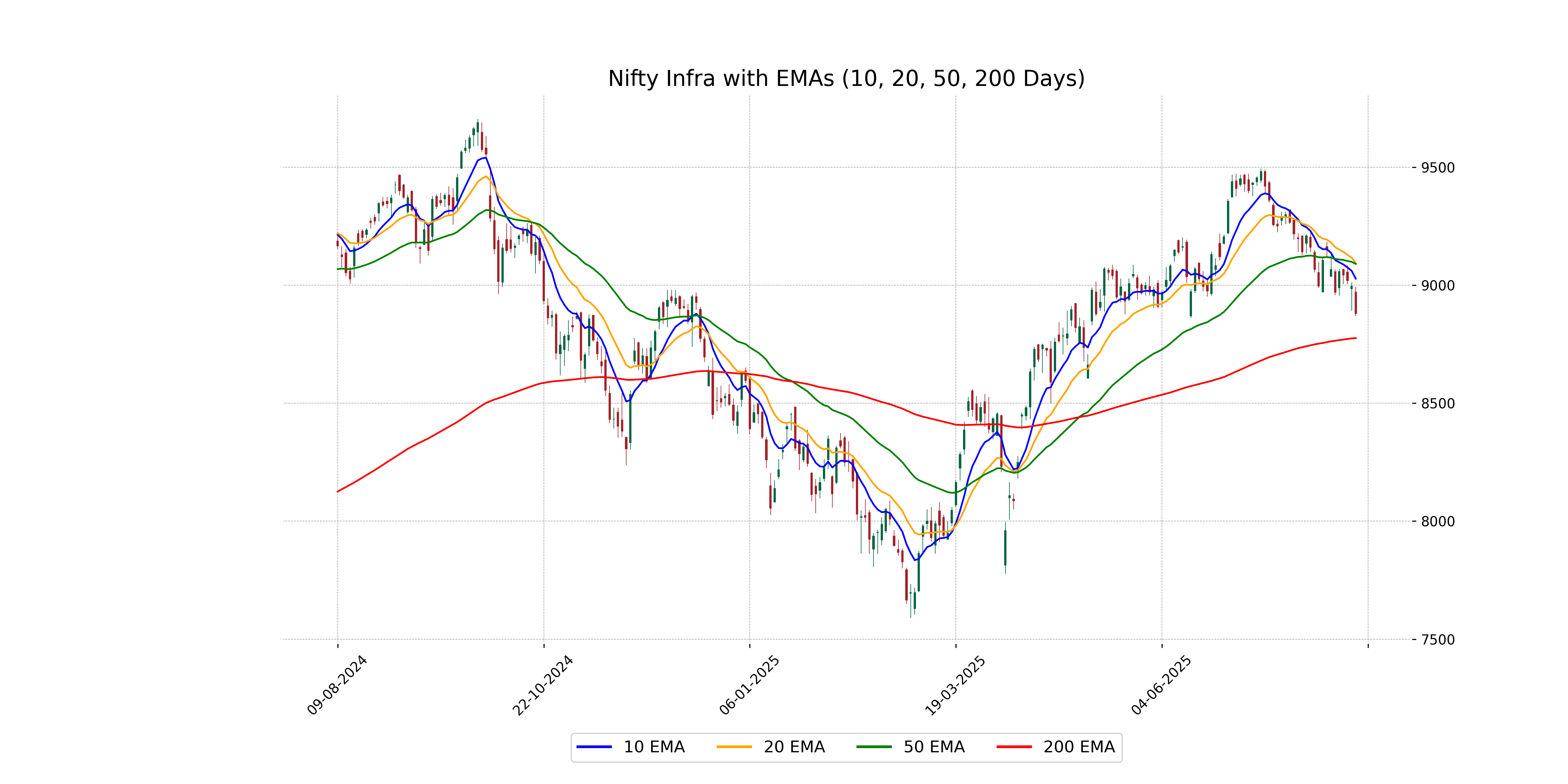 Nifty Infra's closing price of 8879.10 is below its 50-day EMA of 9090.34 and 10-day EMA of 9027.75, but above its 200-day EMA of 8775.66. This suggests a short-term bearish trend with potential longer-term support.
