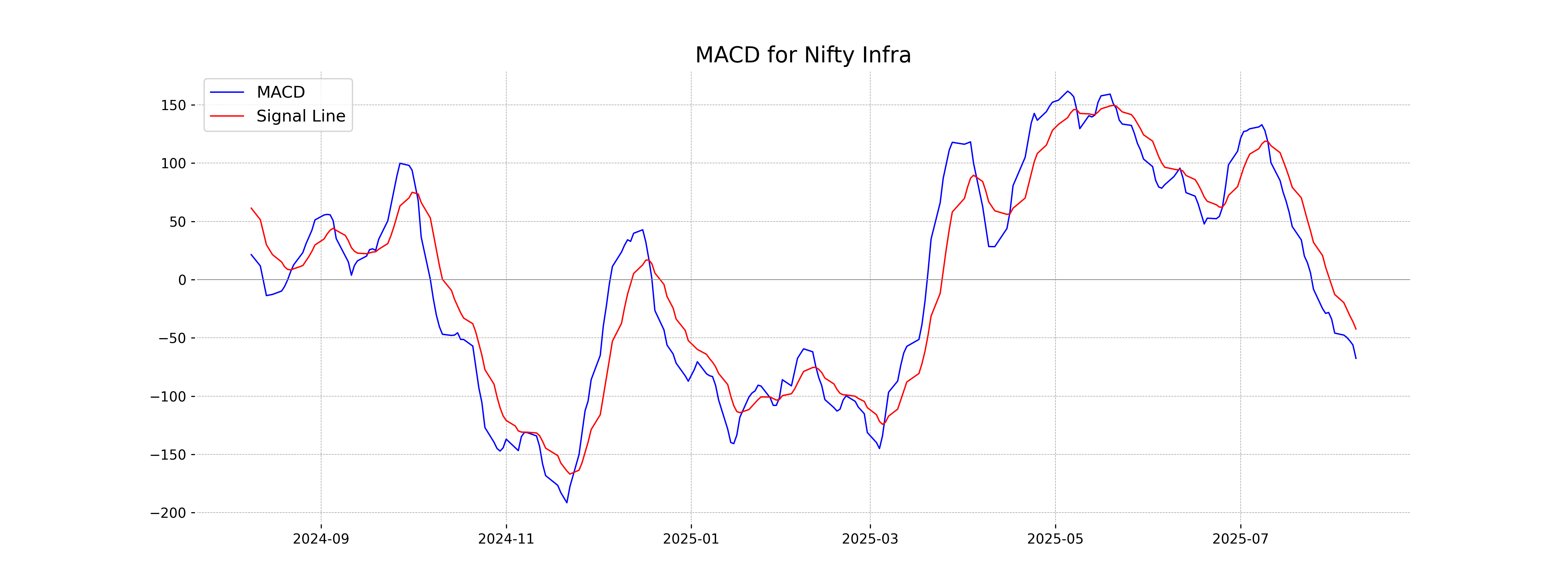 The MACD value for Nifty Infra is -67.57, which is below the MACD Signal of -42.40. This indicates a bearish momentum in the short term, suggesting potential further declines unless a reversal occurs.